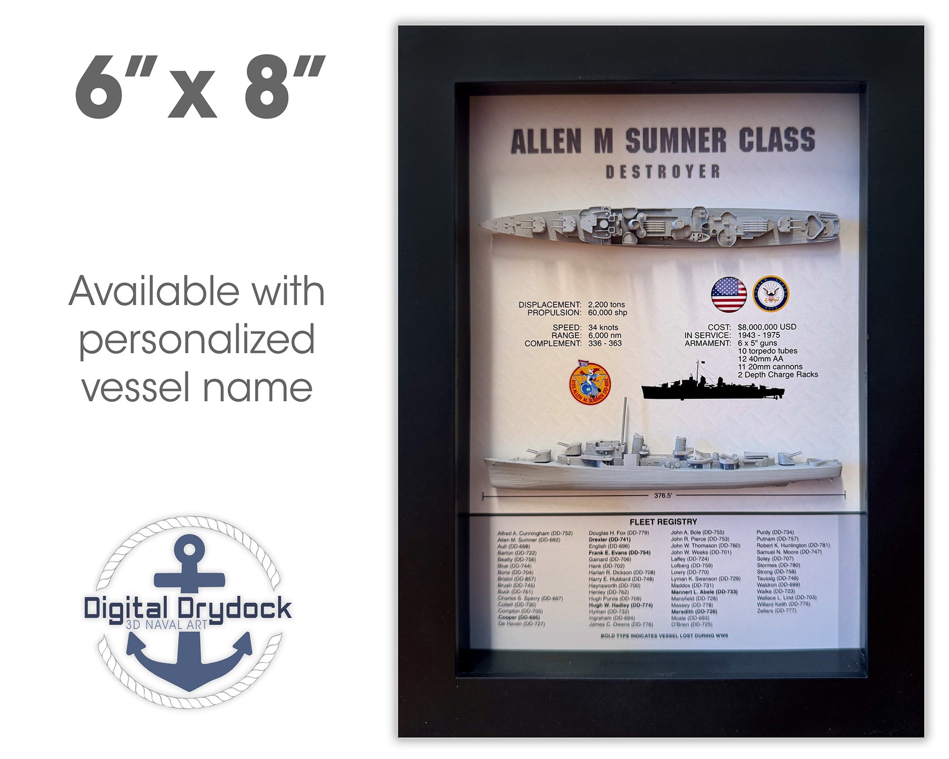 For an additional fee, this frame can be customized to a specific ship within the Allen M Sumner class. Select the "personalized" option and specify the desired vessel at checkout.
