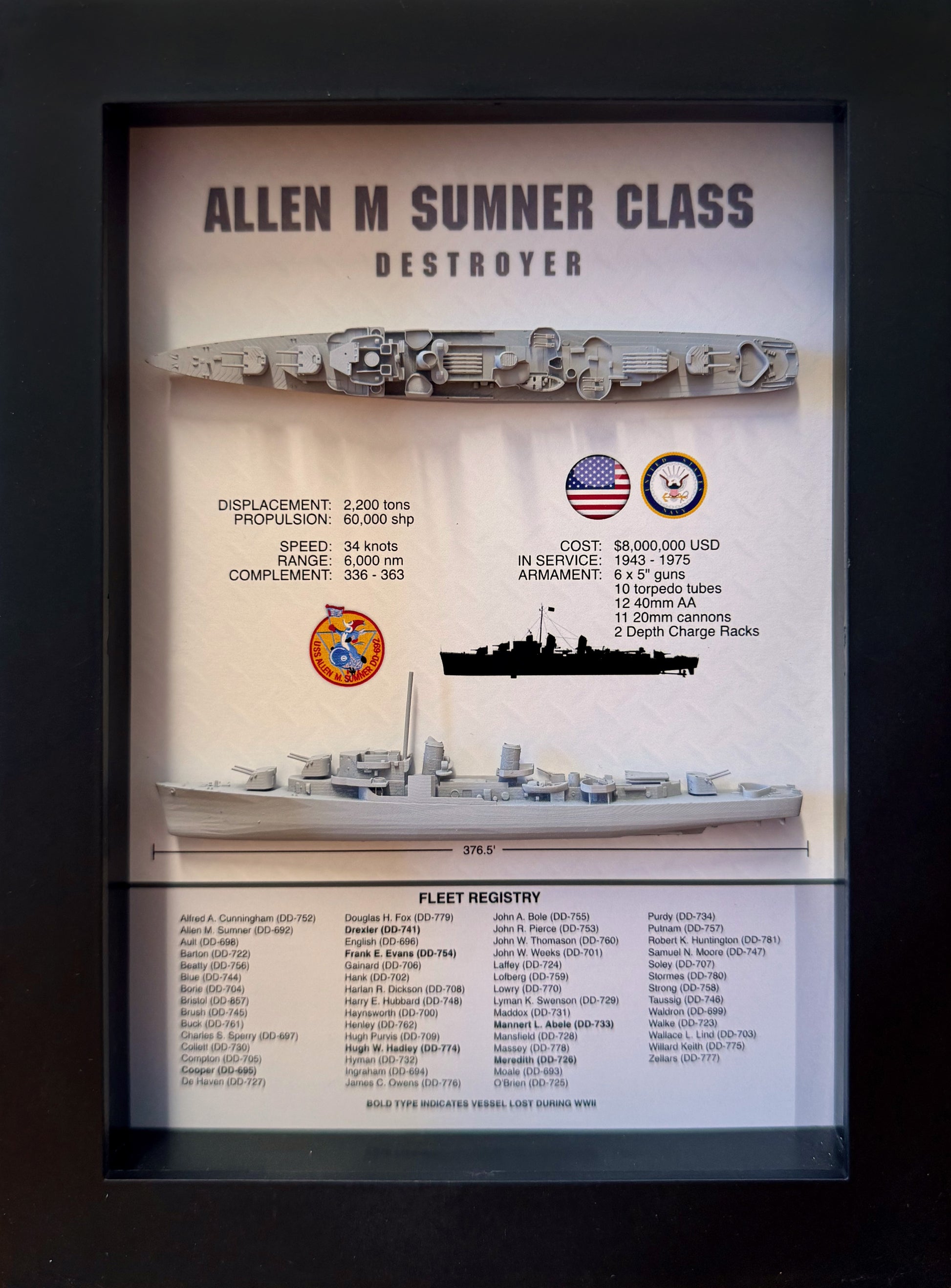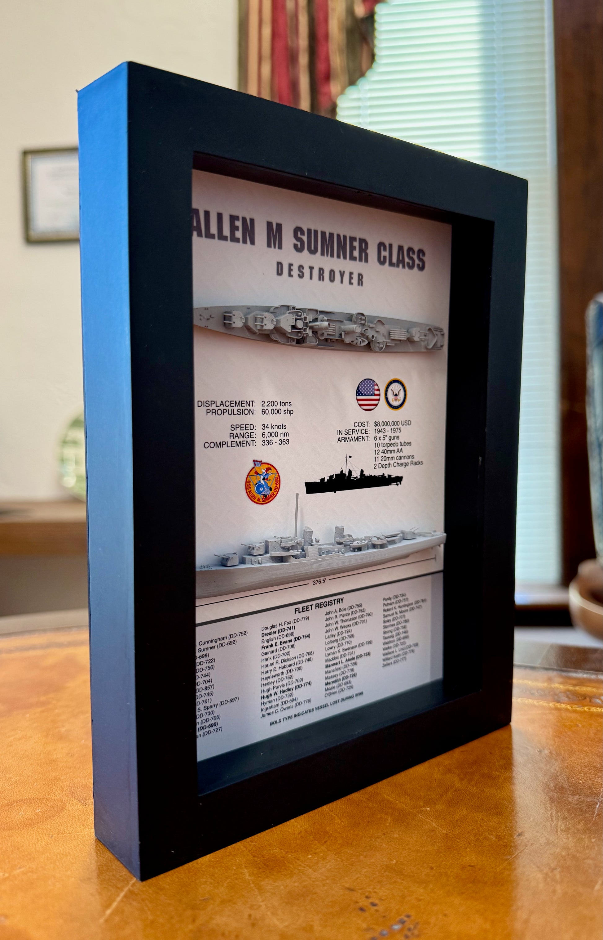 This unique collector box (8.75 x 8.75) pays homage to the Allen M Sumner class destroyer. Named after Admiral Allen M. Sumner, these destroyers were known for their impressive speed, versatility, and firepower. They were powered by steam turbines, allowing them to achieve speeds in excess of 34 knots, making them one of the fastest destroyer classes of their time. This speed, coupled with their agility, made them effective escorts for fleet units and carriers. This unique collector's box features two custom made 3D resin models of the Allen M Sumner Class destroyer - a profile view and an overhead view. In addition to the profile views, this unique display features vital statistics as well as a complete fleet registry listing each Allen M Sumner destroyer constructed.