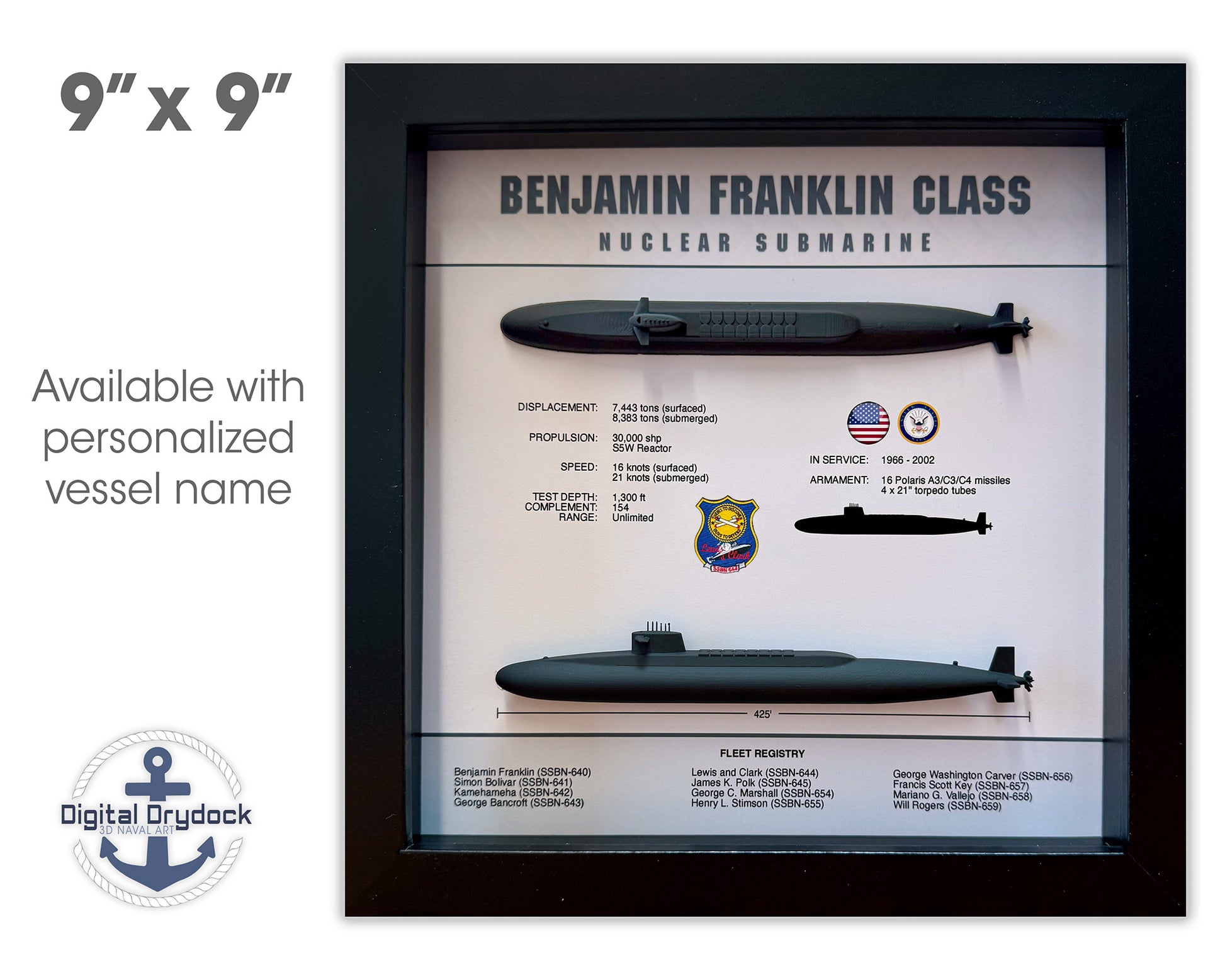For an additional fee, this frame can be customized to a specific ship within the Benjamin Franklin class. Select the "personalized" option and specify the desired sub at checkout.