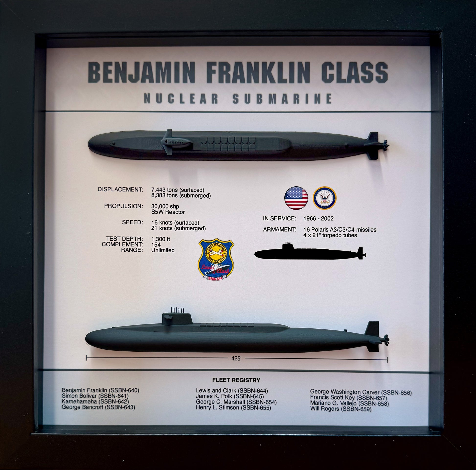 This unique collector box (8.75 x 8.75) pays homage to ballistic missile submarine the Benjamin Franklin Class. The fleet of 12 subs compromised the "41 for Freedom" group of submarines and served into the turn of the century. The first Benjamin Franklin class submarine, SSBN-640, launched in service in 1965. This unique collector's box features two custom made 3D resin models of a Benjamin Franklin Class submarine - a profile view and an overhead view. In addition to the profile views, this unique display features vital statistics as well as a complete fleet registry listing every Benjamin Franklin class submarine constructed.