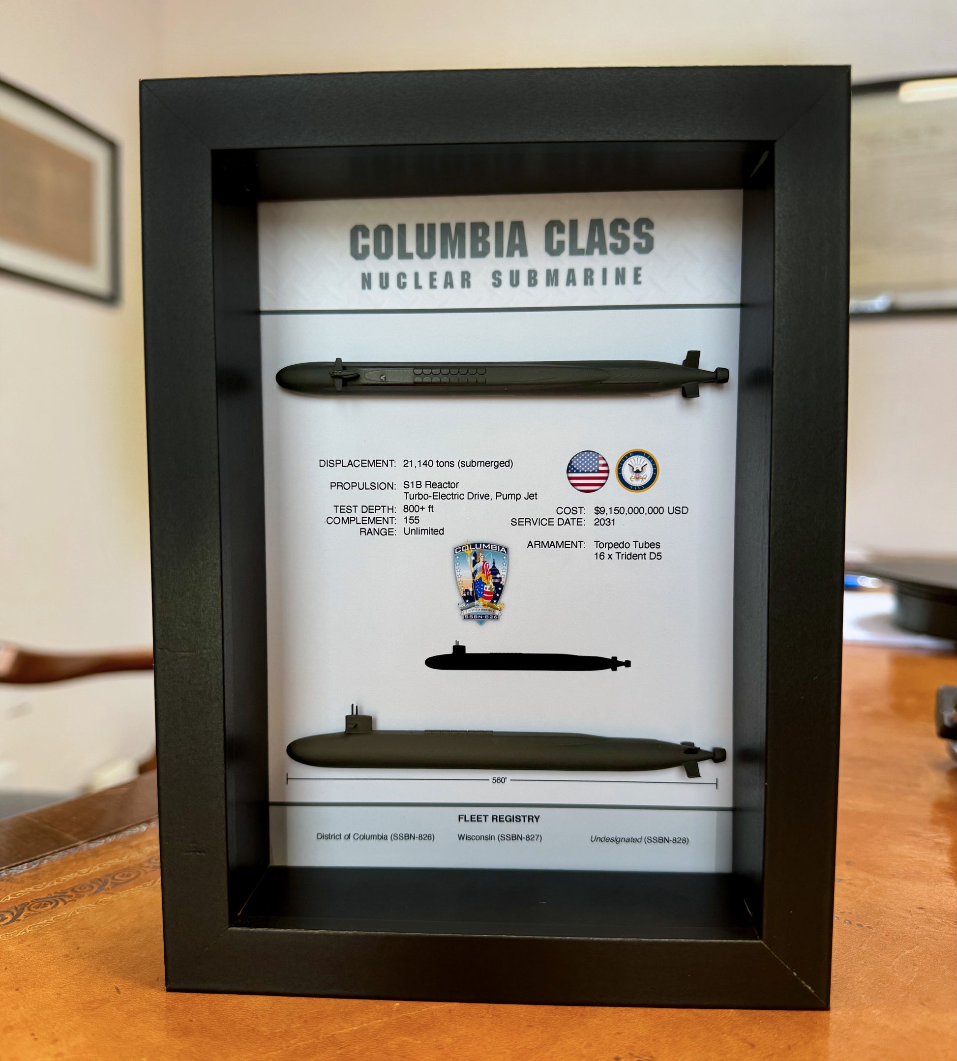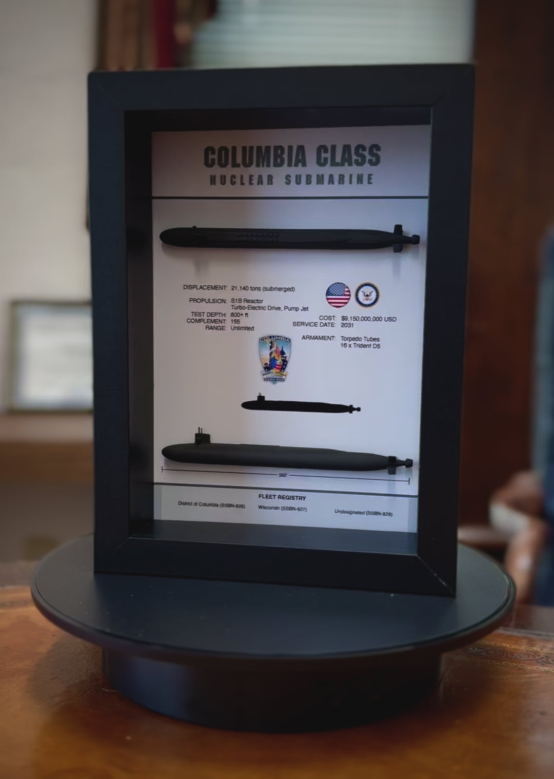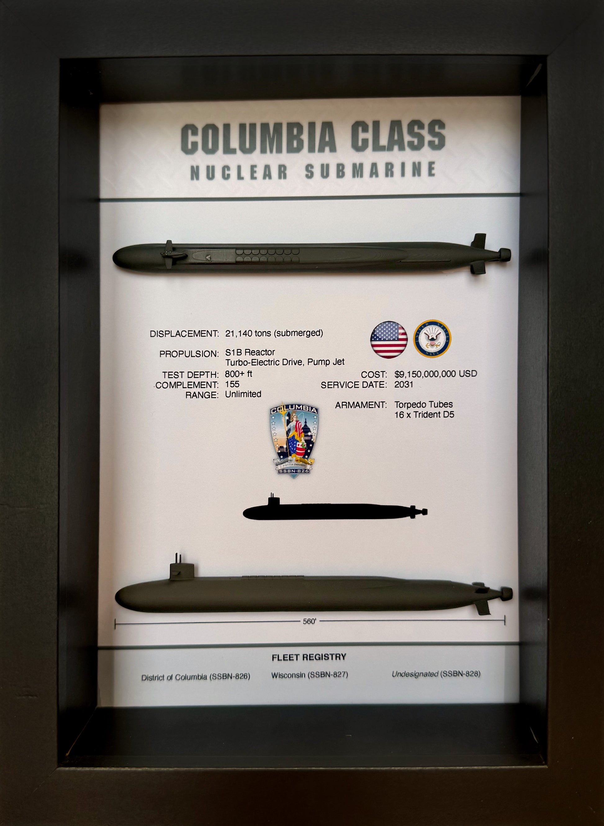 This unique collector box (5.75 x 7.75) pays homage to the Columbia Class submarine: the next generation of ballistic missile submarines in the United States Navy. Its sleek and imposing design equipped with advanced stealth technology allows it to remain undetected by adversaries. This nuclear-powered behemoth is tomorrow’s cornerstone of the nation's strategic deterrence, carrying a payload of intercontinental ballistic missiles ready to safeguard the security of the United States. This unique collector's box features two custom made 3D resin models of a Columbia Class submarine - a profile view and an overhead view. In addition to the profile views, this unique display features vital statistics as well as a fleet registry of each Columbia class submarine.