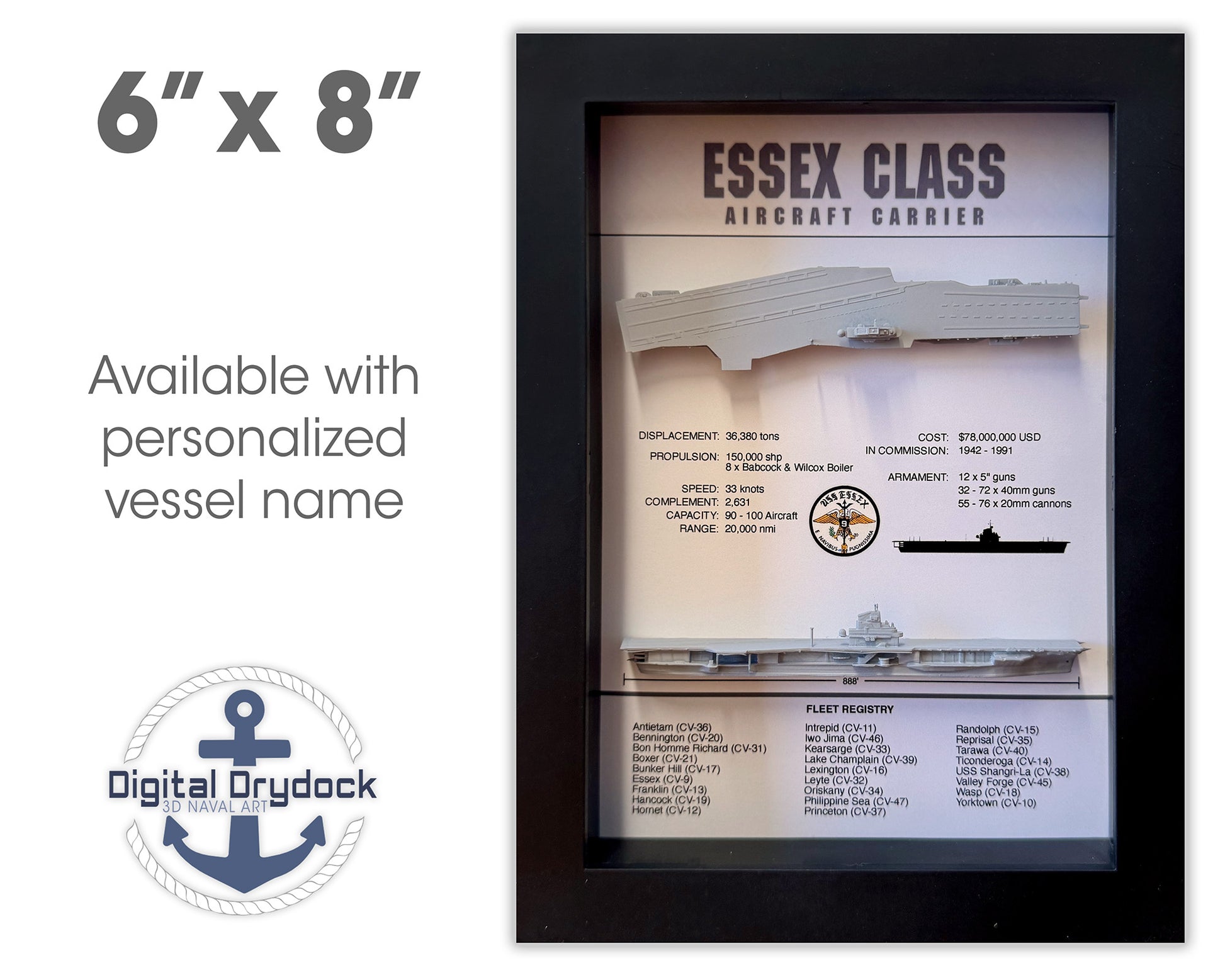 The Essex class aircraft carrier stands as one of the most iconic and influential naval vessels in modern history. Originally designed and constructed during World War II, this class of carriers played a pivotal role in shaping the outcome of the conflict and went on to become a cornerstone of post-war naval power. The first ship of the class, USS Essex (CV-9), was launched in 1942, followed by a total of 24 carriers of this class. Some underwent extensive modernization and upgrades and remained in service well into the Cold War. This collector box (5.75 x 7.75 x 1.2) pays tribute to this impressive class. This handcrafted display features two custom made 3D resin models of an Essex class carrier - a profile view and a top view. The lower part of the display features information pertaining to the carriers within the class. A perfect addition to the collection of any naval enthusiast.