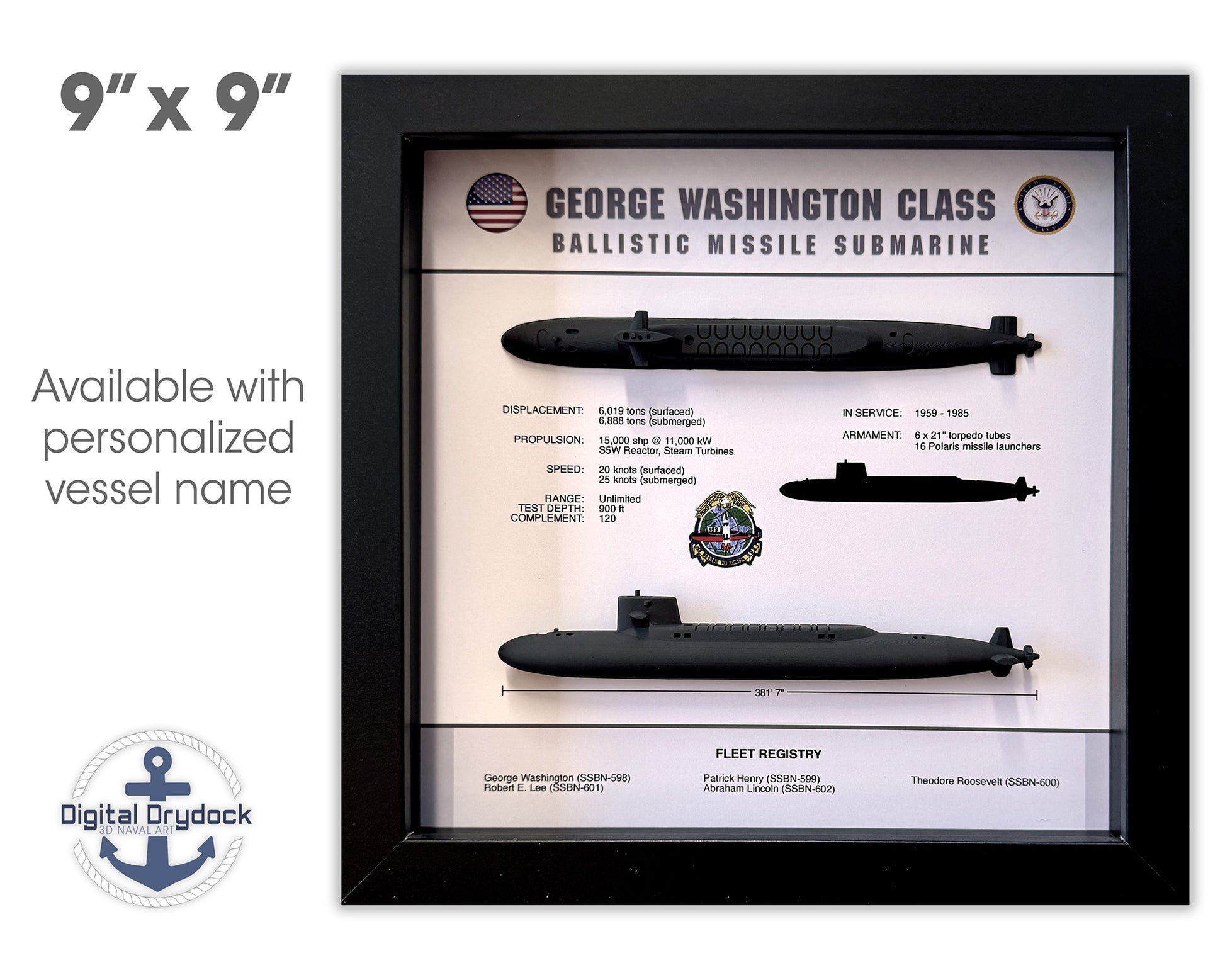 George Washington Class Submarine Memorial Display Shadow Box, 9" x 9", Large, Black