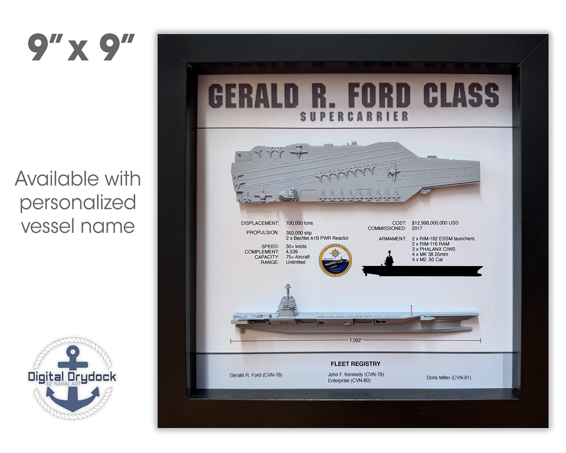 Gerald R Ford Class Display Shadow Box, CVN-78, 9" x 9", Black