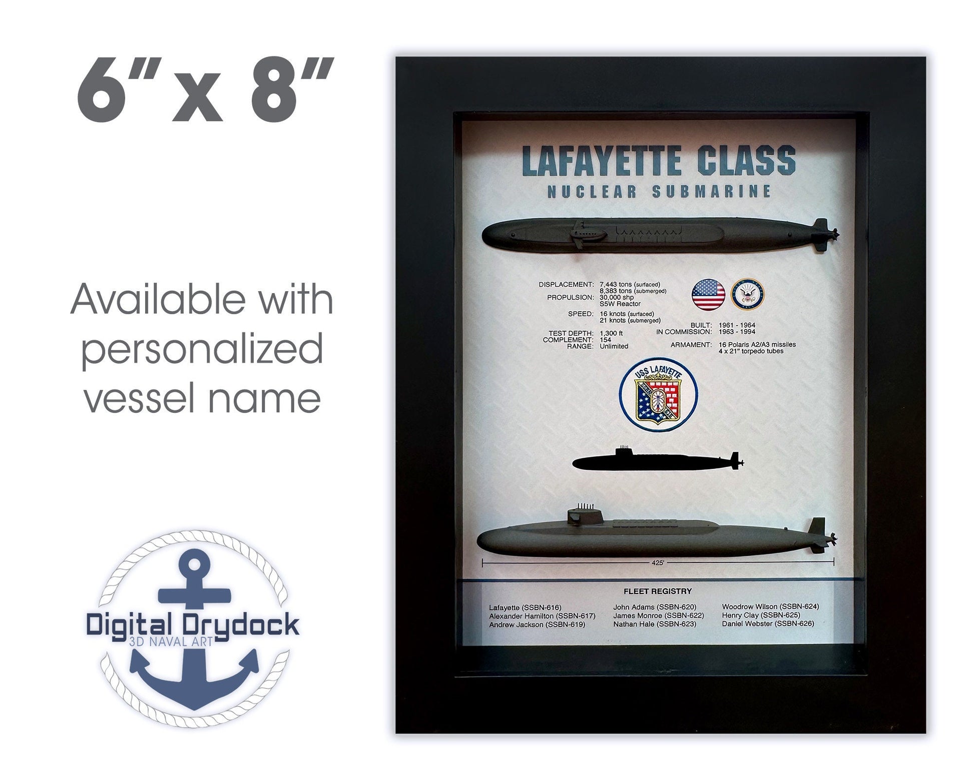 Please note for an additional fee, the display can be customized to a specific vessel within the Lafayette Class. The vessel name can be entered in the "Special Instructions" field in the shopping cart during the checkout process.