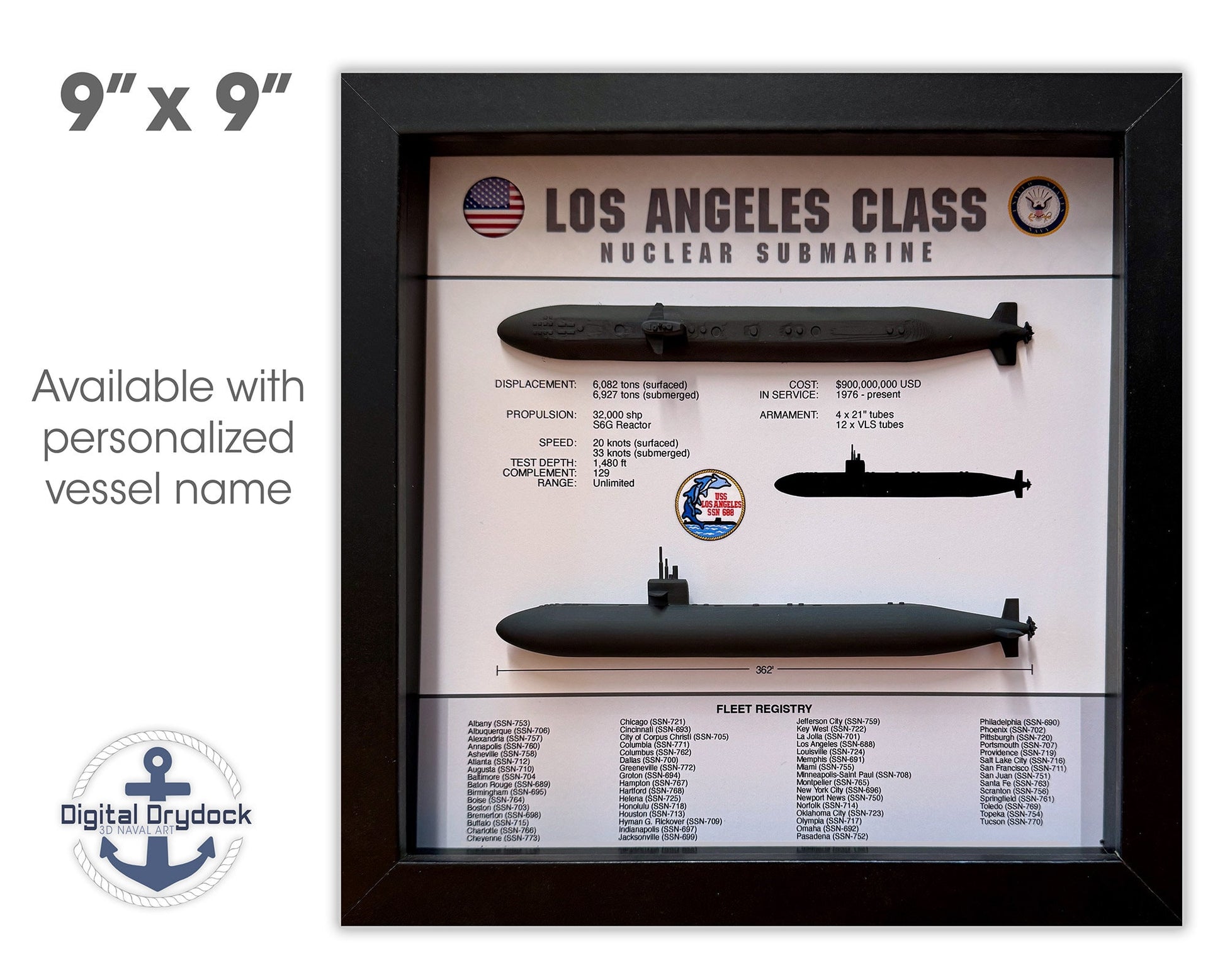 This unique collector box (8.75 x 8.75) pays homage to the largest submarine class in the US fleet: the Los Angeles Class Fast Attack Submarine. The first Los Angeles class submarine, SSN-688, went into service in 1976 and 62 were eventually built. This unique collector's box features two custom made 3D resin models of a Los Angeles Class submarine - a profile view and an overhead view. In addition to the profile views, this unique display features vital statistics as well as a complete fleet registry listing every Los Angeles class submarine constructed.