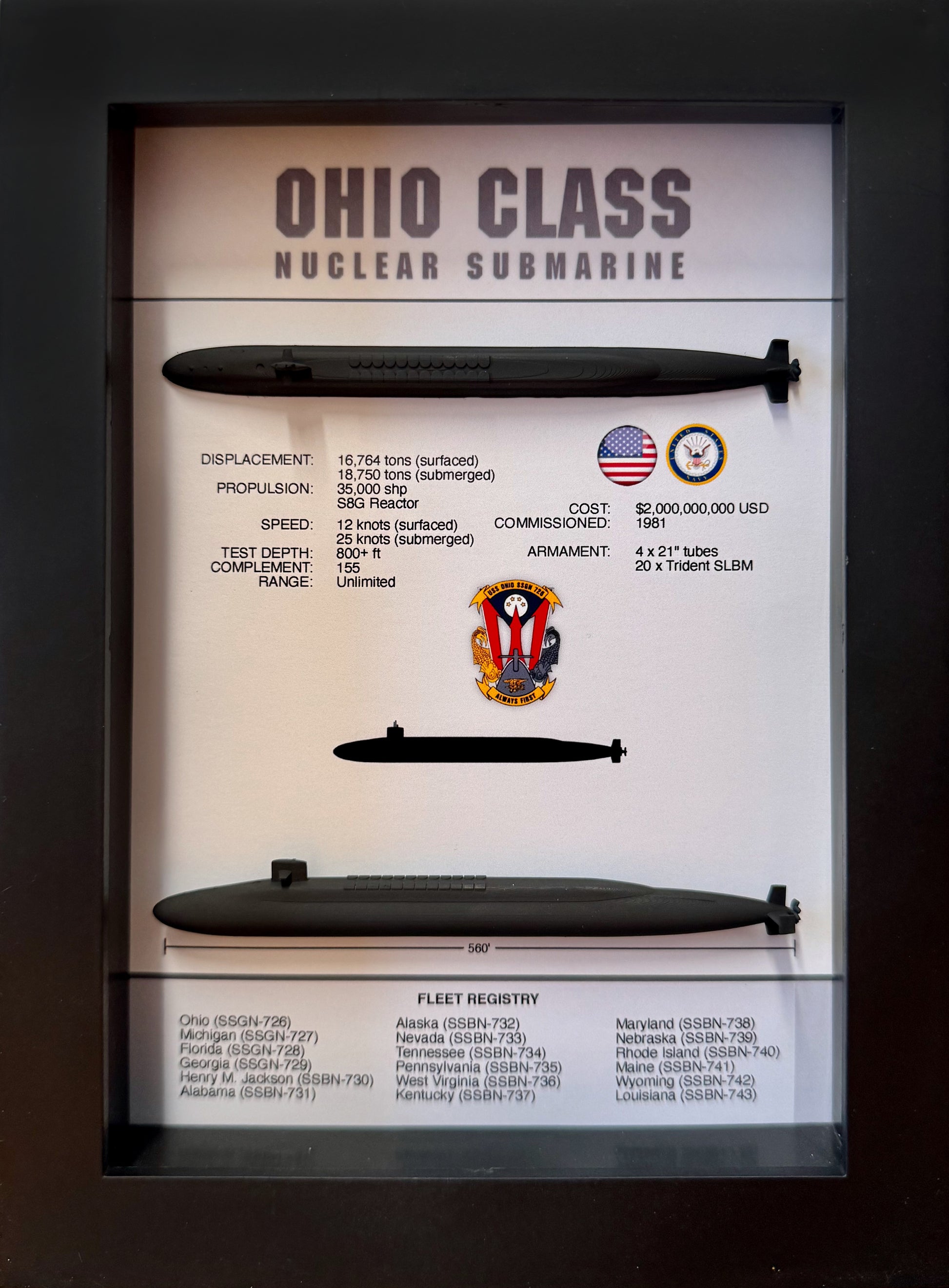 This unique collector box (5.75 x 7.75) pays homage to the Ohio Class Submarine. The first Ohio class submarine, SSGN-726, went into service in 1981 and 18 were eventually built. This unique collector's box features two custom made 3D resin models of an Ohio Class submarine - a profile view and an overhead view. In addition to the profile views, this unique display features vital statistics as well as a complete fleet registry listing every Ohio class submarine constructed.