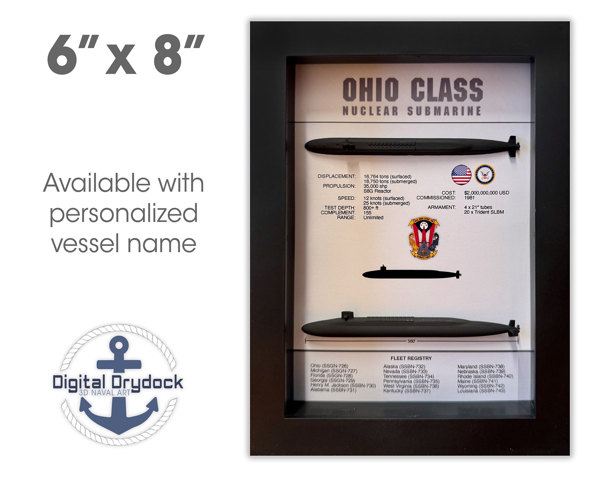 Please note for an additional fee, the display can be customized to a specific vessel within the Ohio Class. The vessel name can be entered in the "Special Instructions" field in the shopping cart during the checkout process.