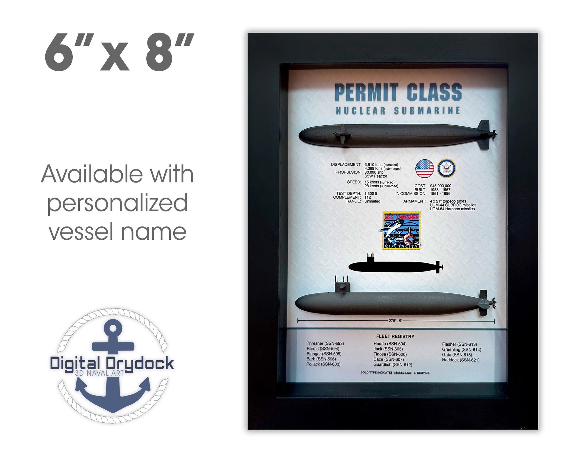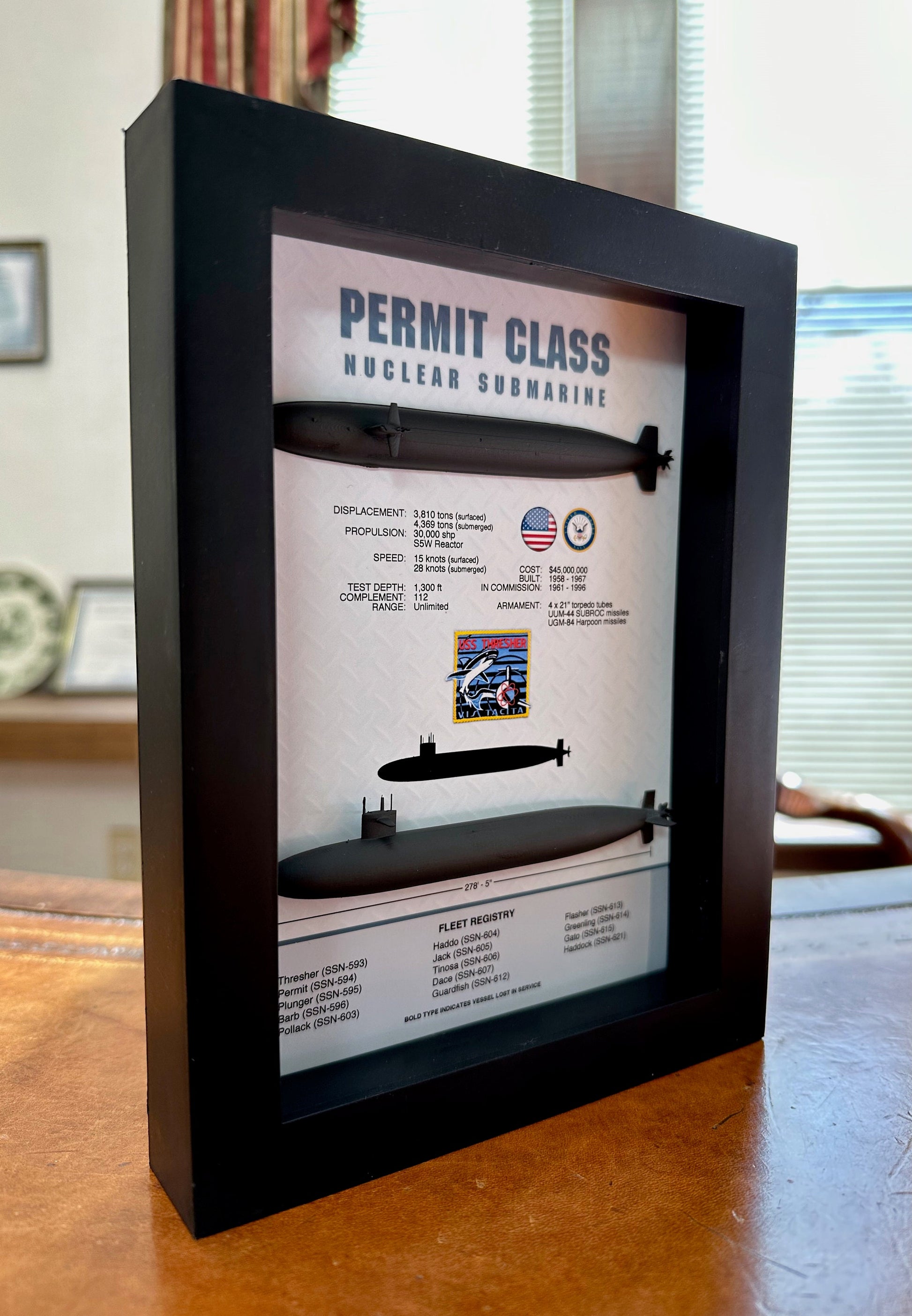 Permit Class Submarine Memorial Display Shadow Box, Thresher Class, 6" x 8", Black