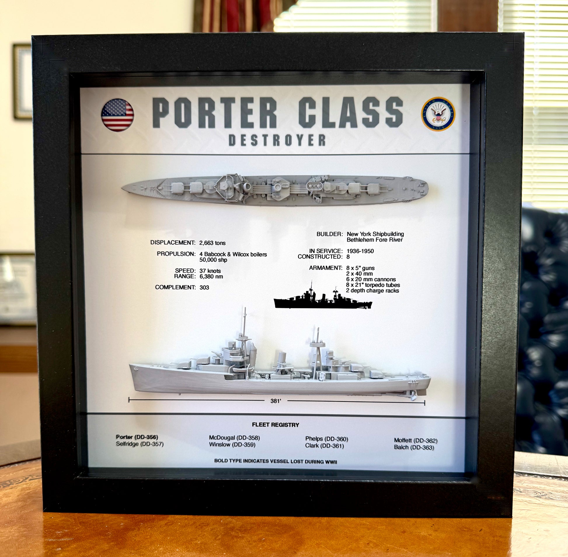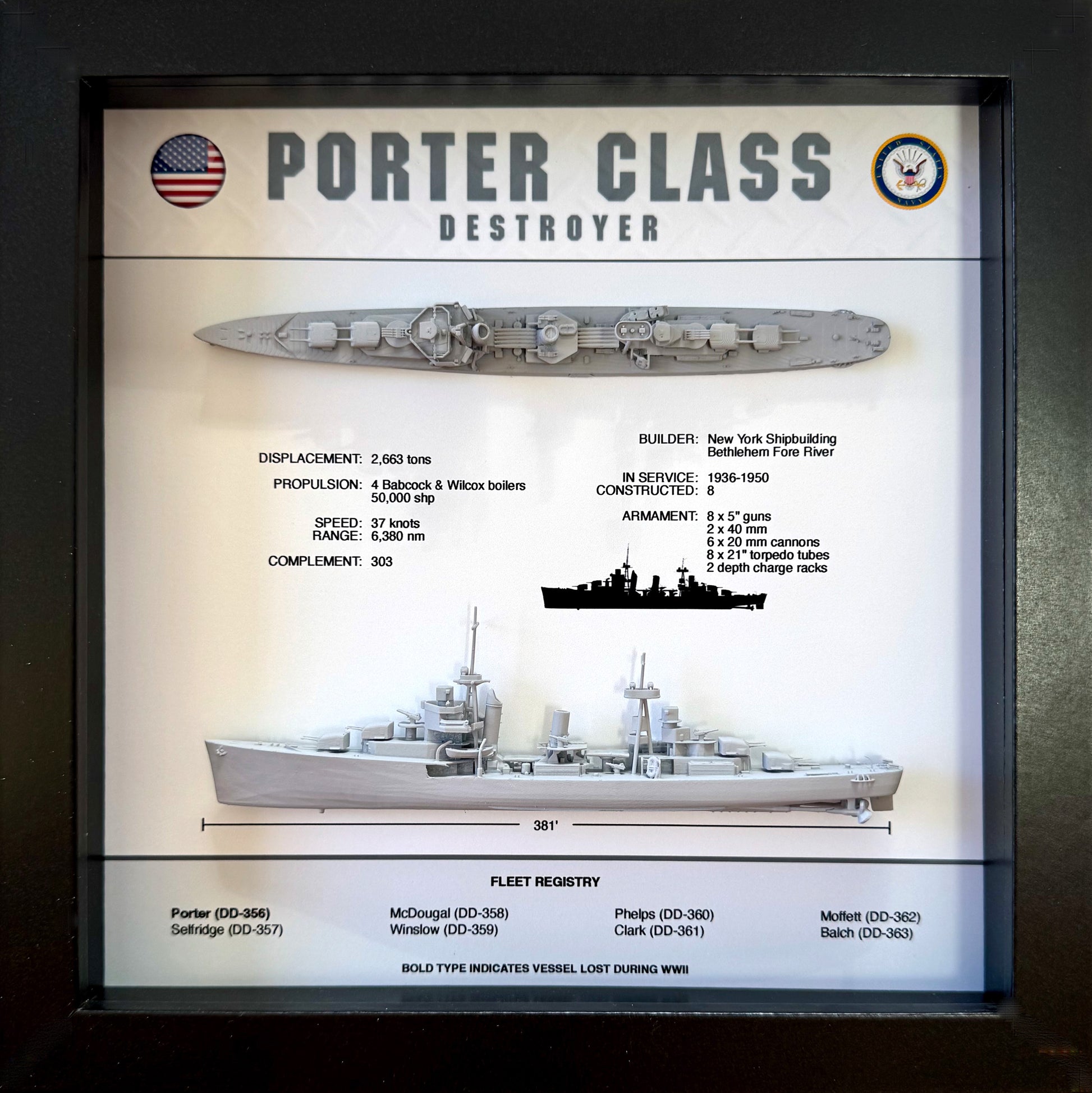 This handcrafted display features two custom-made 3D resin models of a Porter Class destroyer—one showing a detailed side profile and the other an overhead deck view. The models are mounted alongside key statistics and a complete fleet register. Housed in a black wood shadow box with a glass front, this piece blends educational value with visual appeal.