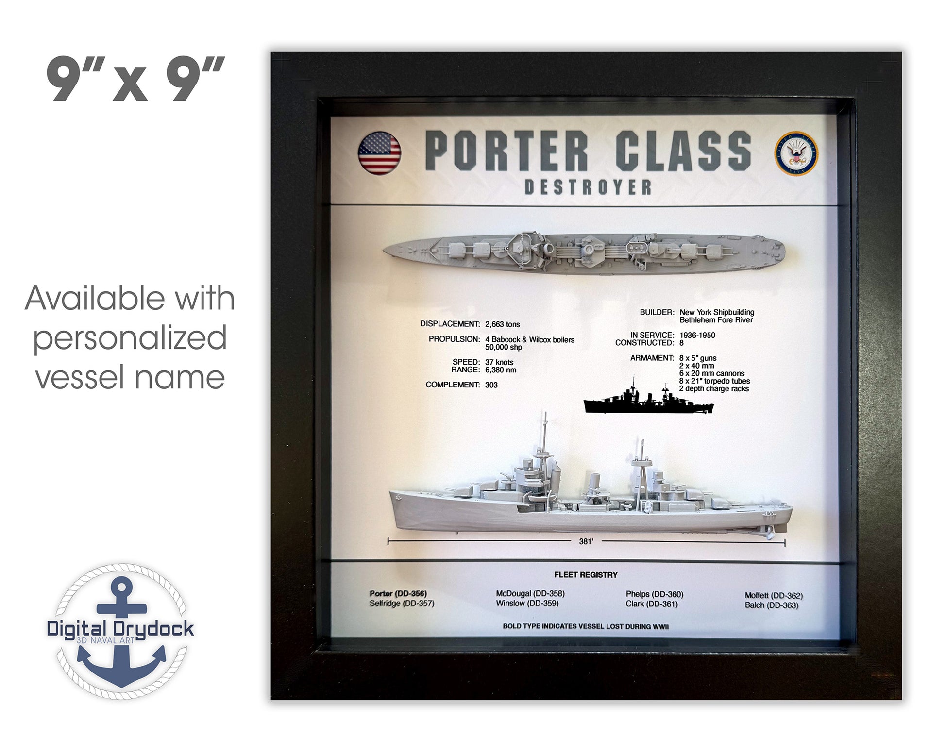 Porter Class Destroyer Memorial Display Shadow Box, WW2, 9" x 9"