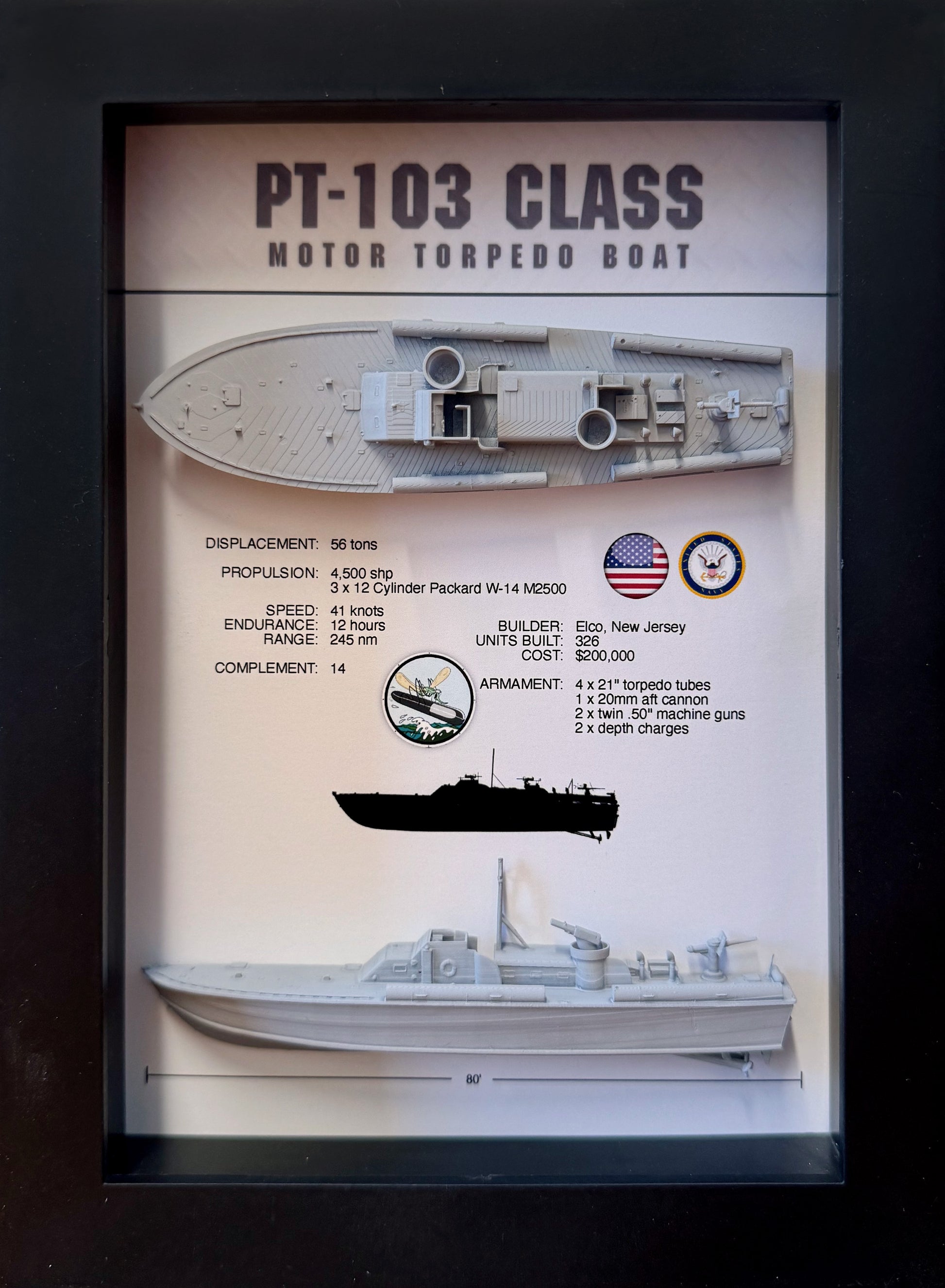 This unique collector box (5.75 x 7.75 x 1.1) pays homage to the PT-103 class of Motor Torpedo Boats. Often associated with PT-109, the PT-103 class consisted of 326 commissioned boats. This unique collector's box features two custom made 3D resin models of the PT-103 - a profile view and an overhead view.