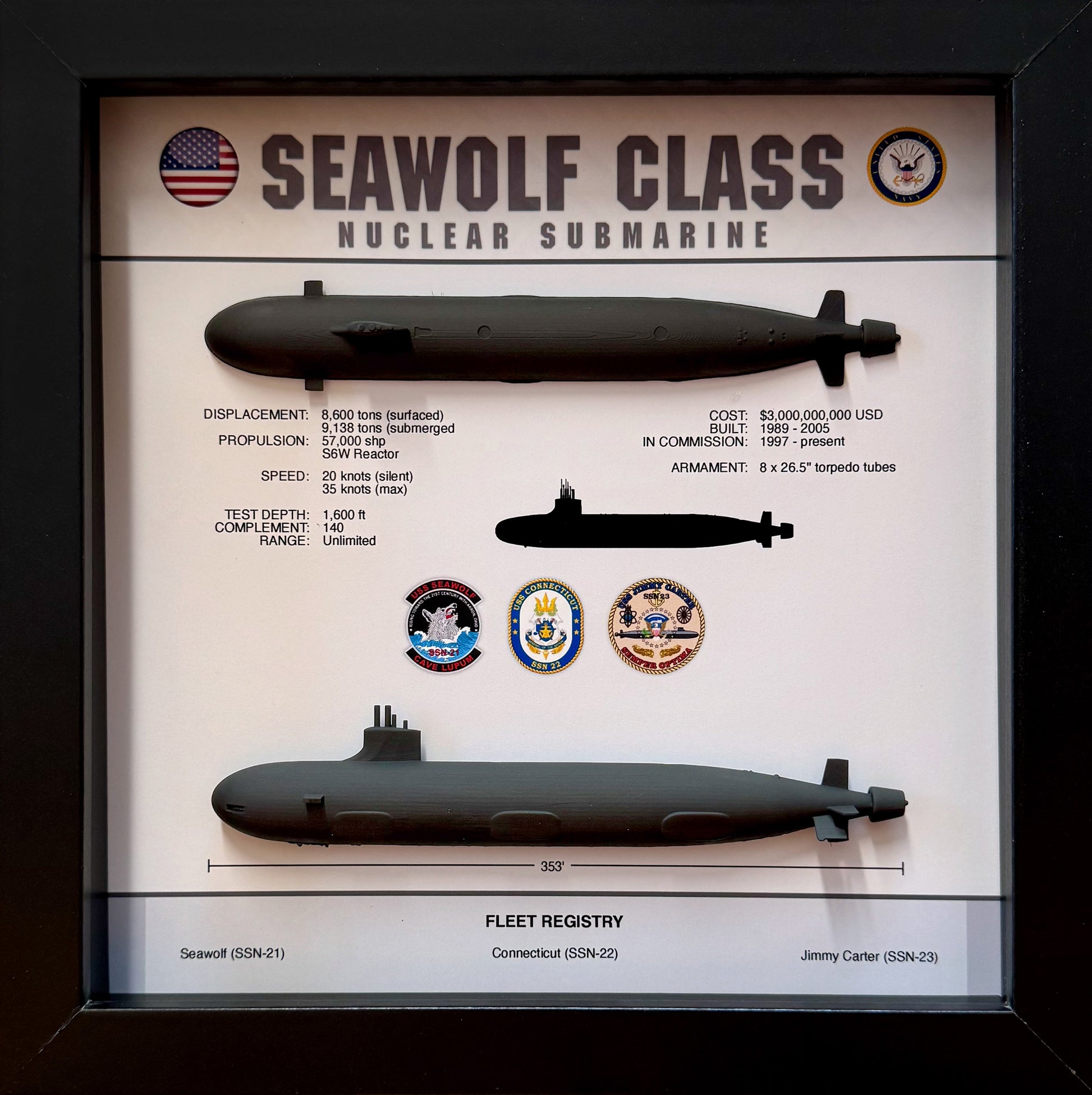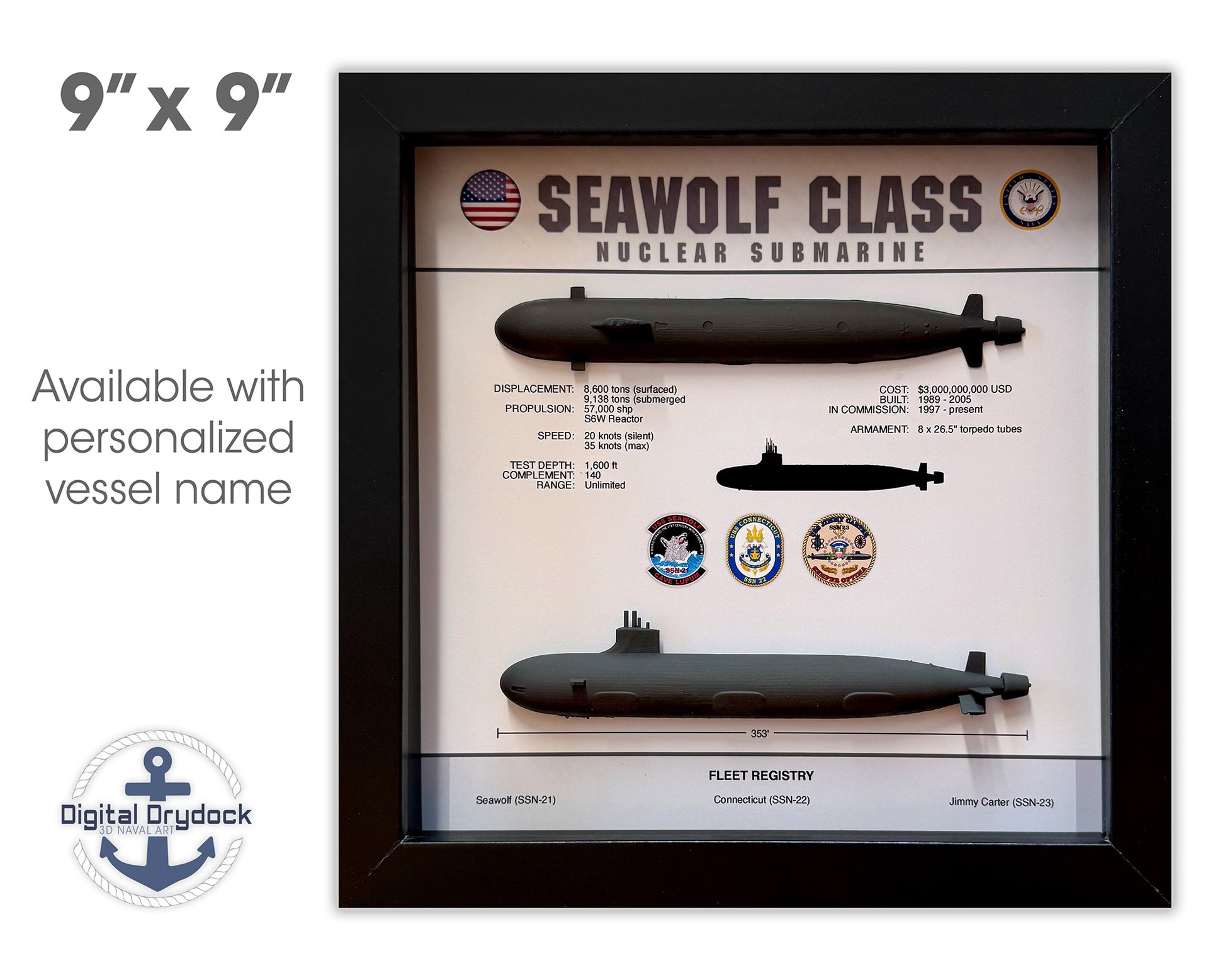 This unique collector box (8.75 x 8.75) pays homage to the Seawolf class fast attack submarine - the most expensive fast attack submarine ever built and the second most expensive submarine ever constructed. The Seawolf class was designed as a successor to the Los Angeles class and was designed to be larger, faster, and significantly quieter. This unique collector's box features two custom made 3D resin models of a Seawolf Class submarine - a profile view and an overhead view. In addition to the profile views, this unique display features vital statistics as well as a fleet registry listing each Seawolf class submarine.