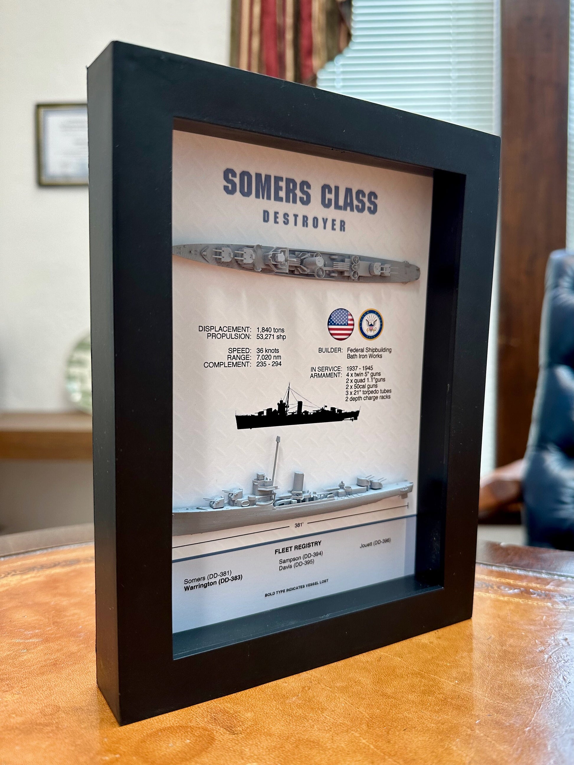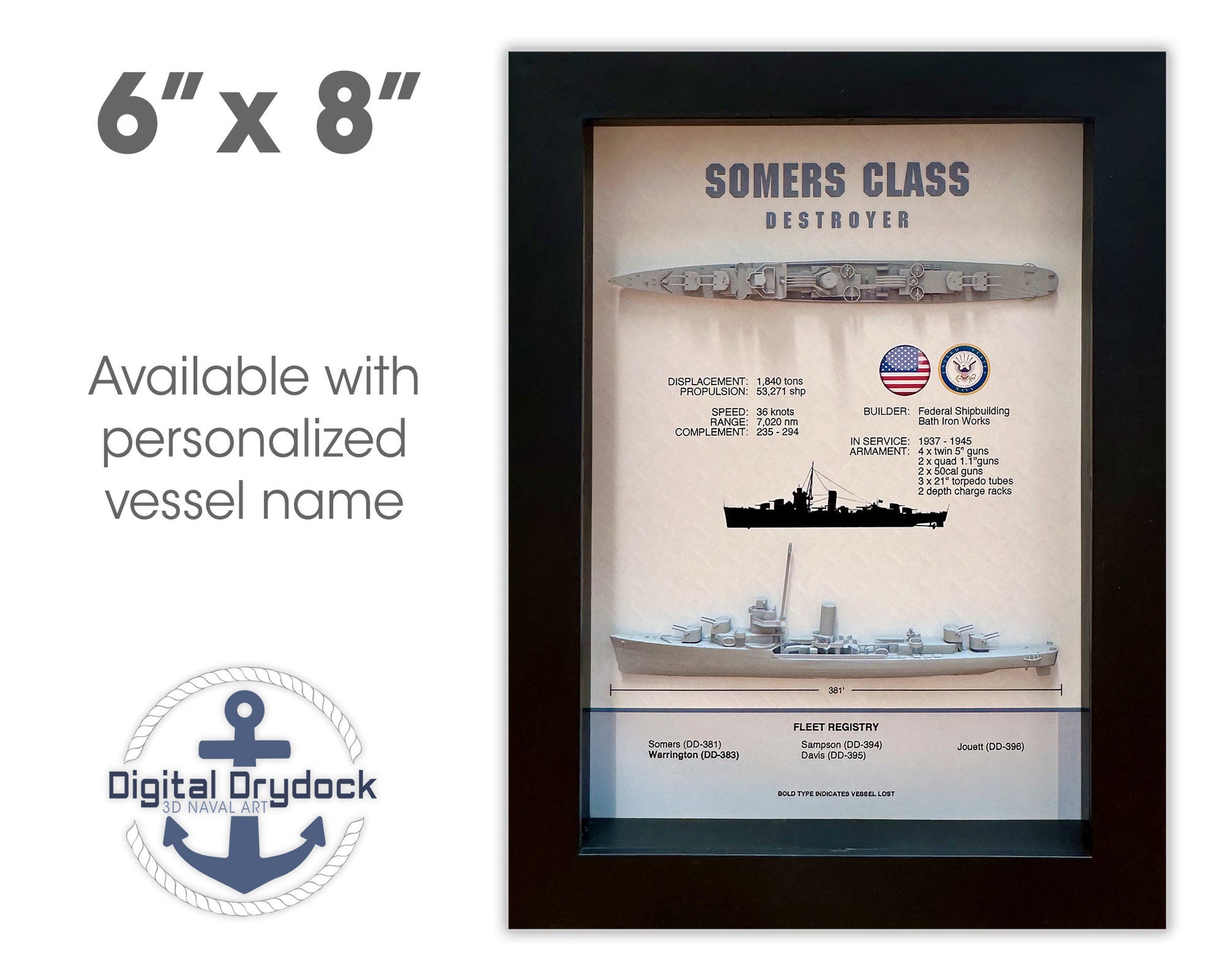 Please note for an additional fee, the display can be customized to a specific vessel within the Somers Class. The vessel name can be entered in the "Special Instructions" field in the shopping cart during the checkout process.