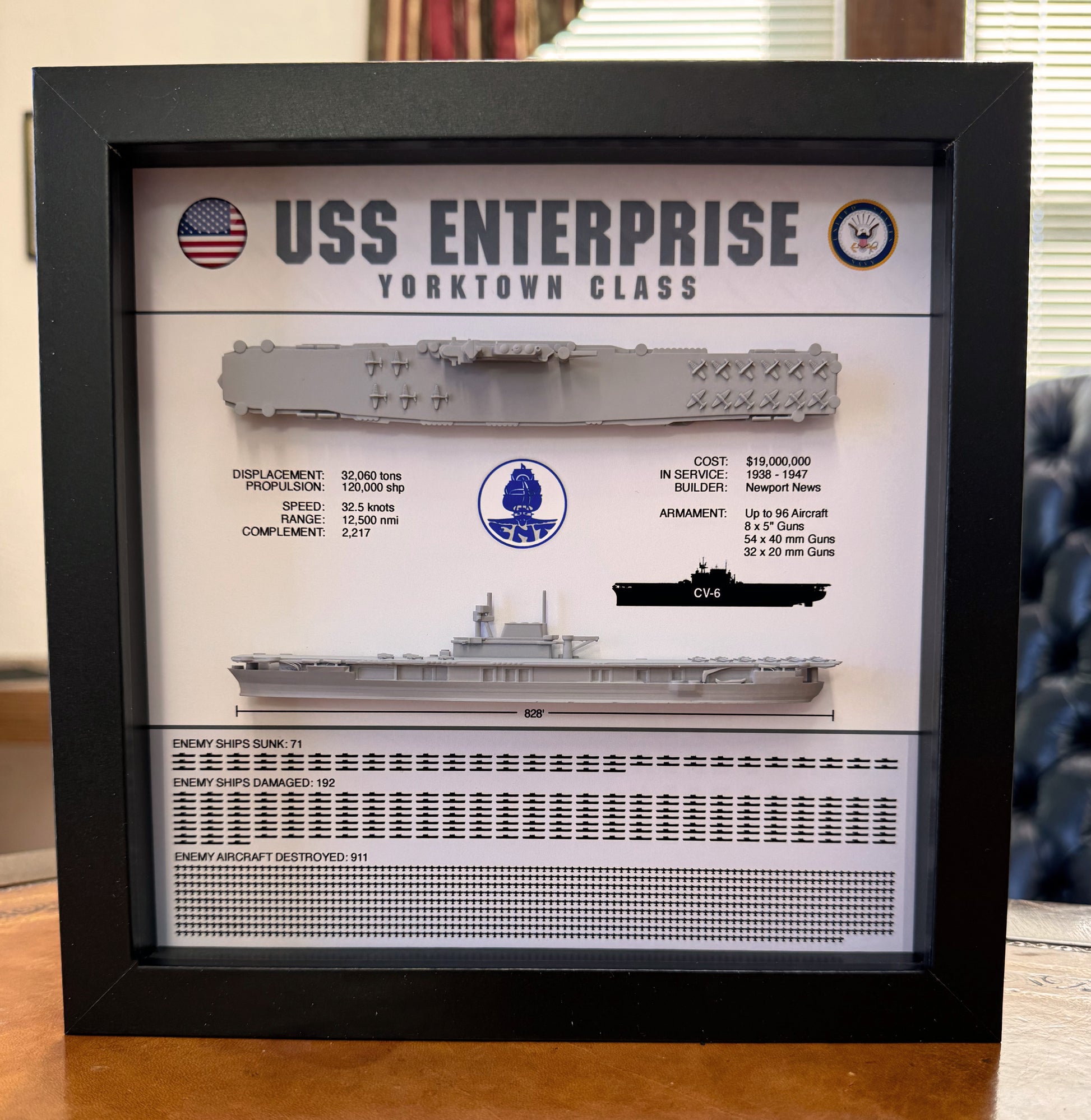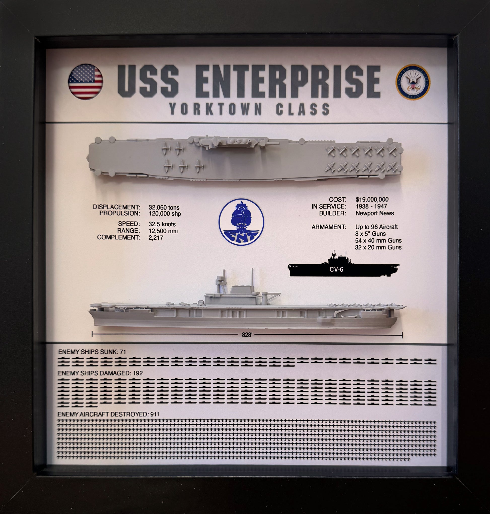 This unique collector box (8.75 x 8.75) pays homage to the most decorated ship of World War II and one of the most enduring symbols of the US Navy - the USS Enterprise (CV-6). This handcrafted display features two custom made 3D resin models of this Yorktown Class carrier - a profile view and a top view. The box includes vital statistics and profile views in addition to information pertaining to the "Big-E's" impressive war record.