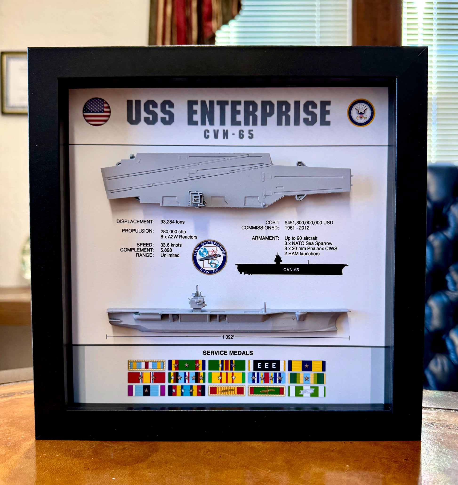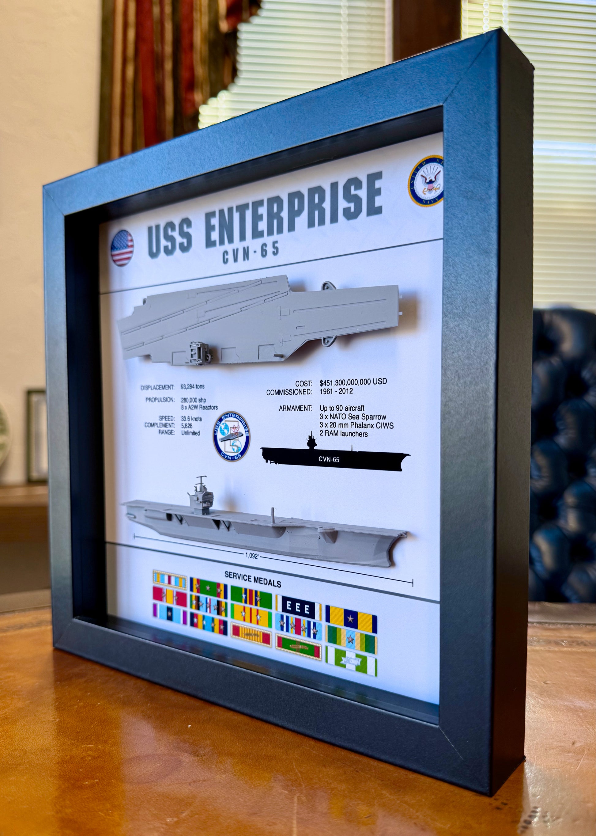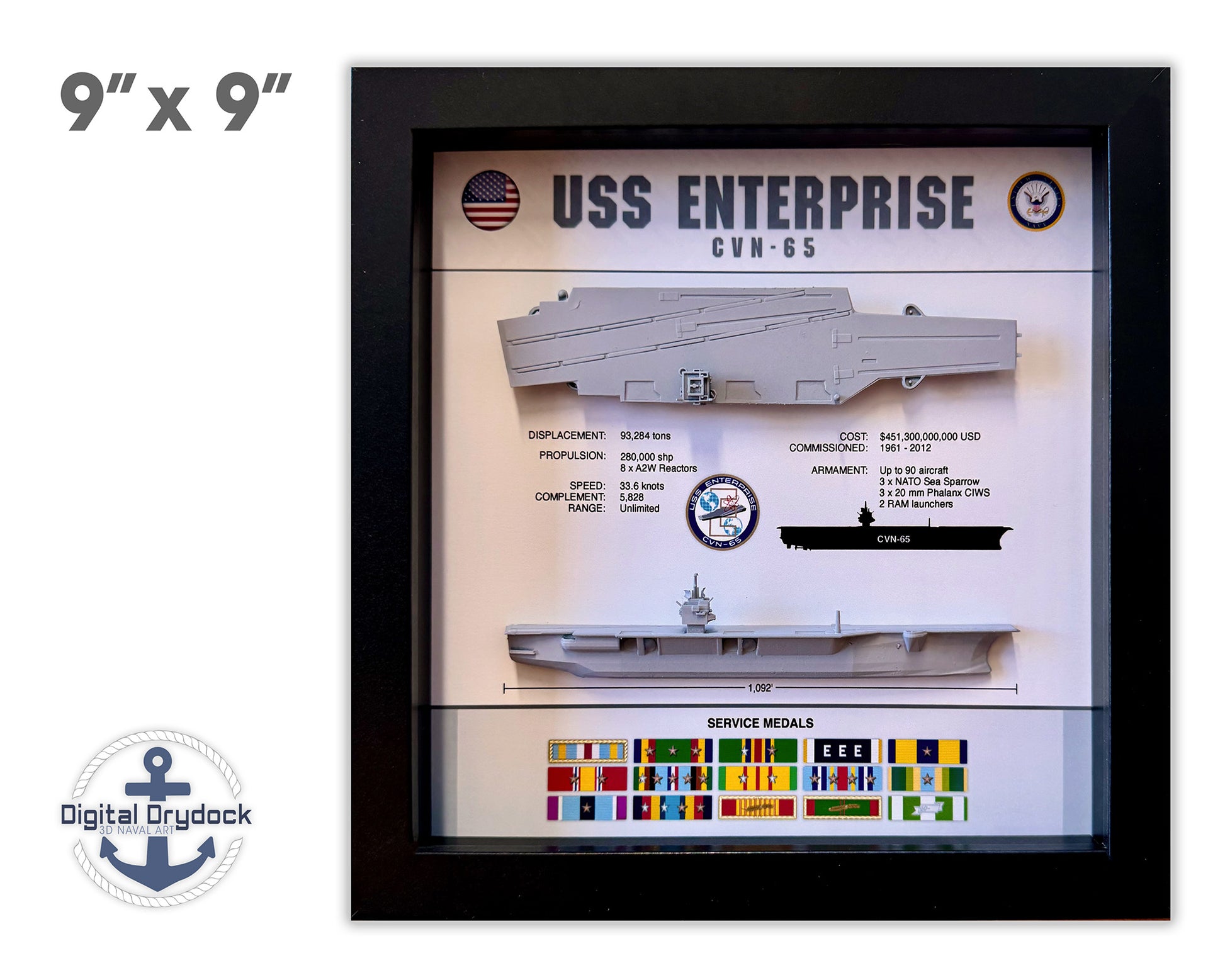This unique collector box (8.75 x 8.75) pays homage to the one of the most legendary aircraft carriers in United State history... the CVN-65. Not only was she the world's first nuclear powered carrier, she was also one of the biggest vessels launched. The ships iconic design with its angled flight deck and steam catapults, made it capable of launching and recovering aircraft with ease. Throughout its illustrious career, the USS Enterprise played a pivotal role in numerous conflicts and operations, including the Cuban Missile Crisis, the Vietnam War, Operation Desert Storm, and the War on Terror. This handcrafted display features two custom made 3D resin models of this CVN-65 - a profile view and a top view. The shadow box has a glass front.