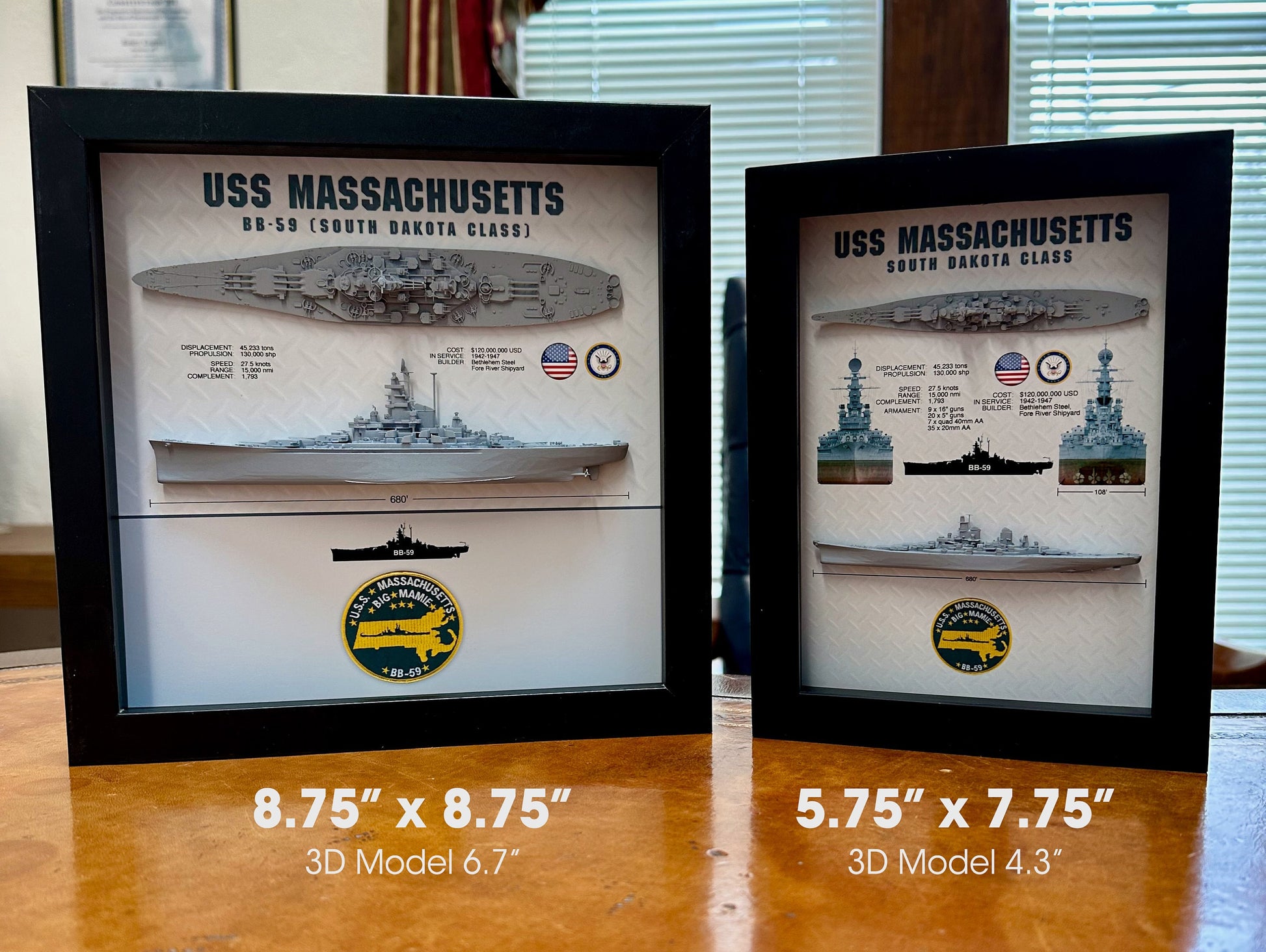 This unique memorial box (8.75 x 8.75 x 1.2) pays homage to the "Big Mamie" - the USS Massachusetts. The third South Dakota Class Battleship constructed, with 9 16" guns and and 20 5" guns, the Massachusetts was designated the US Flagship during Operation Torch in 1942. This handcrafted display features two custom made 3D resin models of the this South Dakota class Battleship - a profile view and an overhead view. The box includes vital statistics and profile views in addition to Big Mamie's commemorative logo. Mounted in a black shadow box with a glass panel.