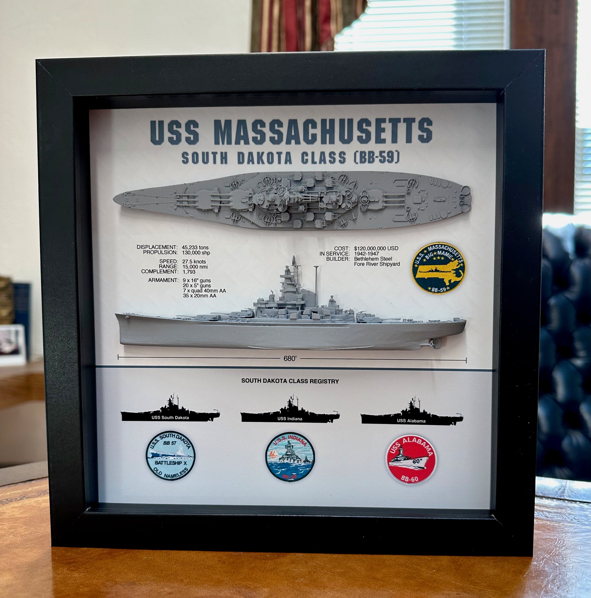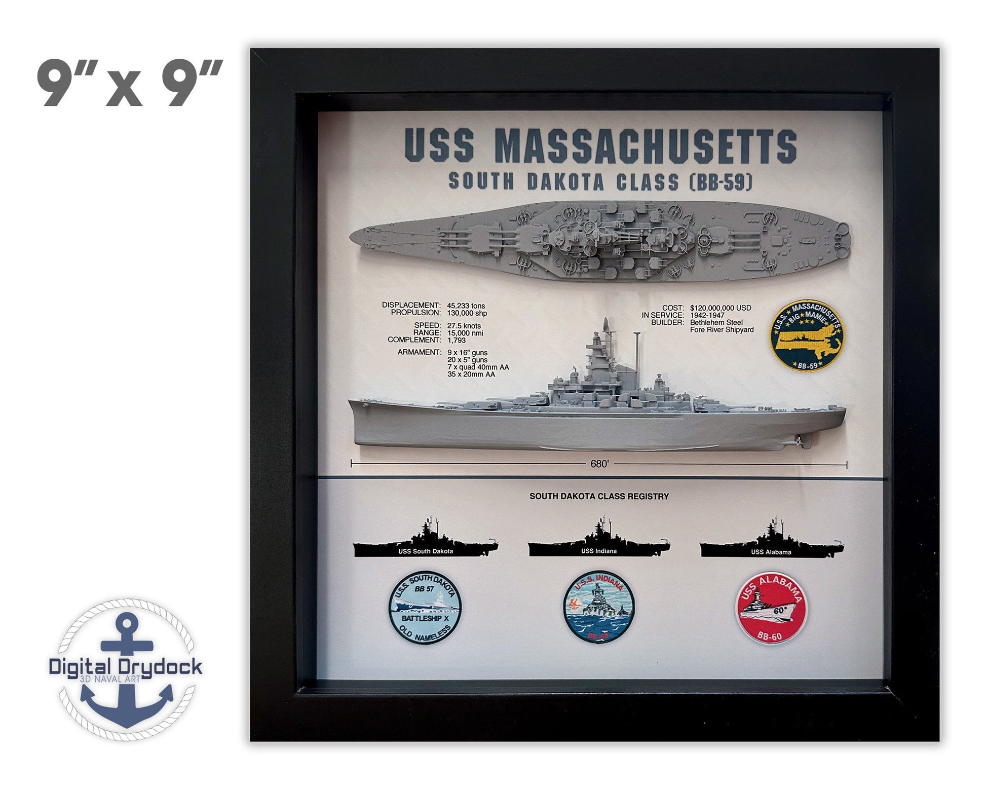 USS Massachusetts Battleship Display Shadow Box, BB-59, South Dakota Class, WW2, 9" x 9", Black