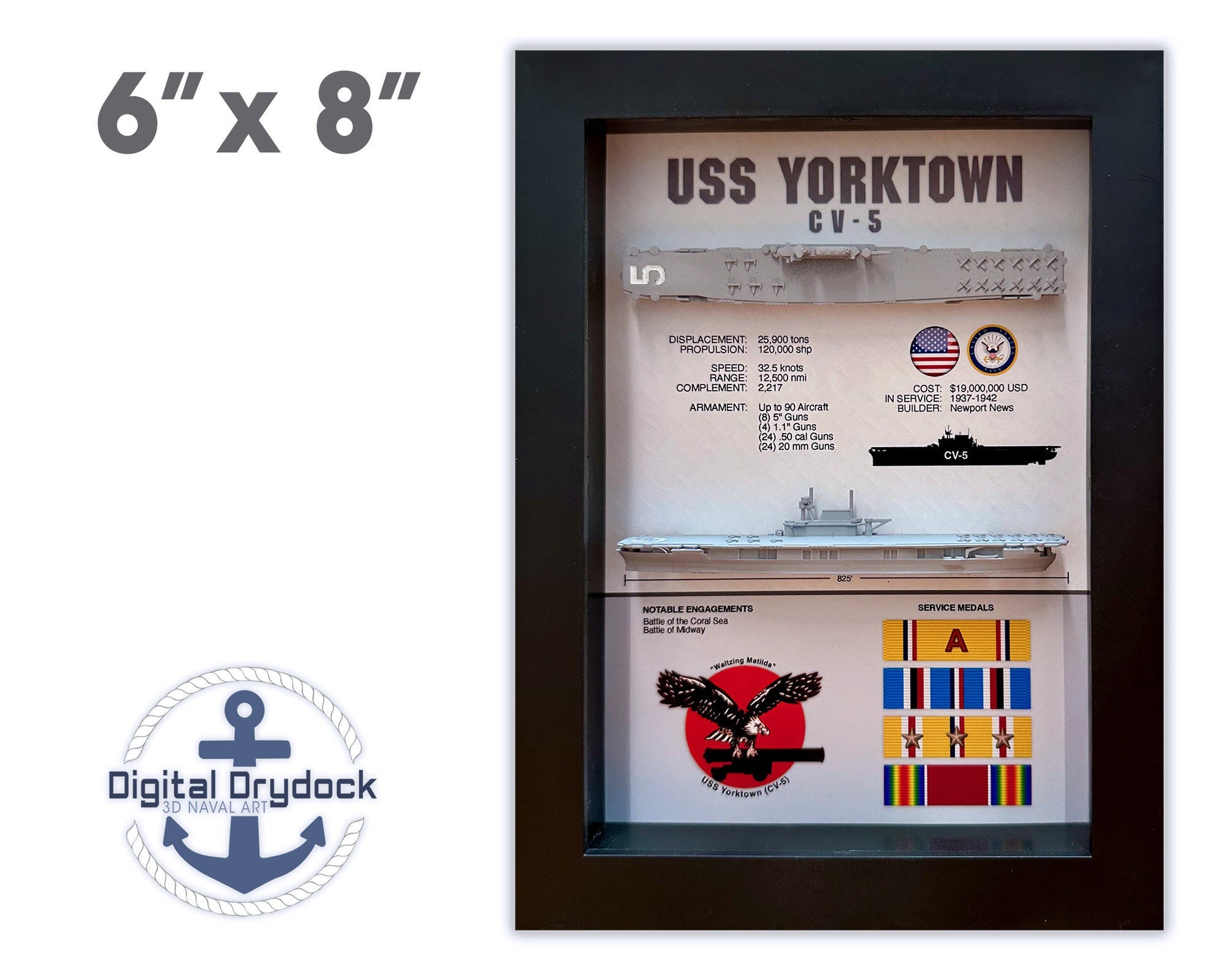 USS Yorktown Memorial Display Shadow Box, CV-5, 6" x 8", Black
