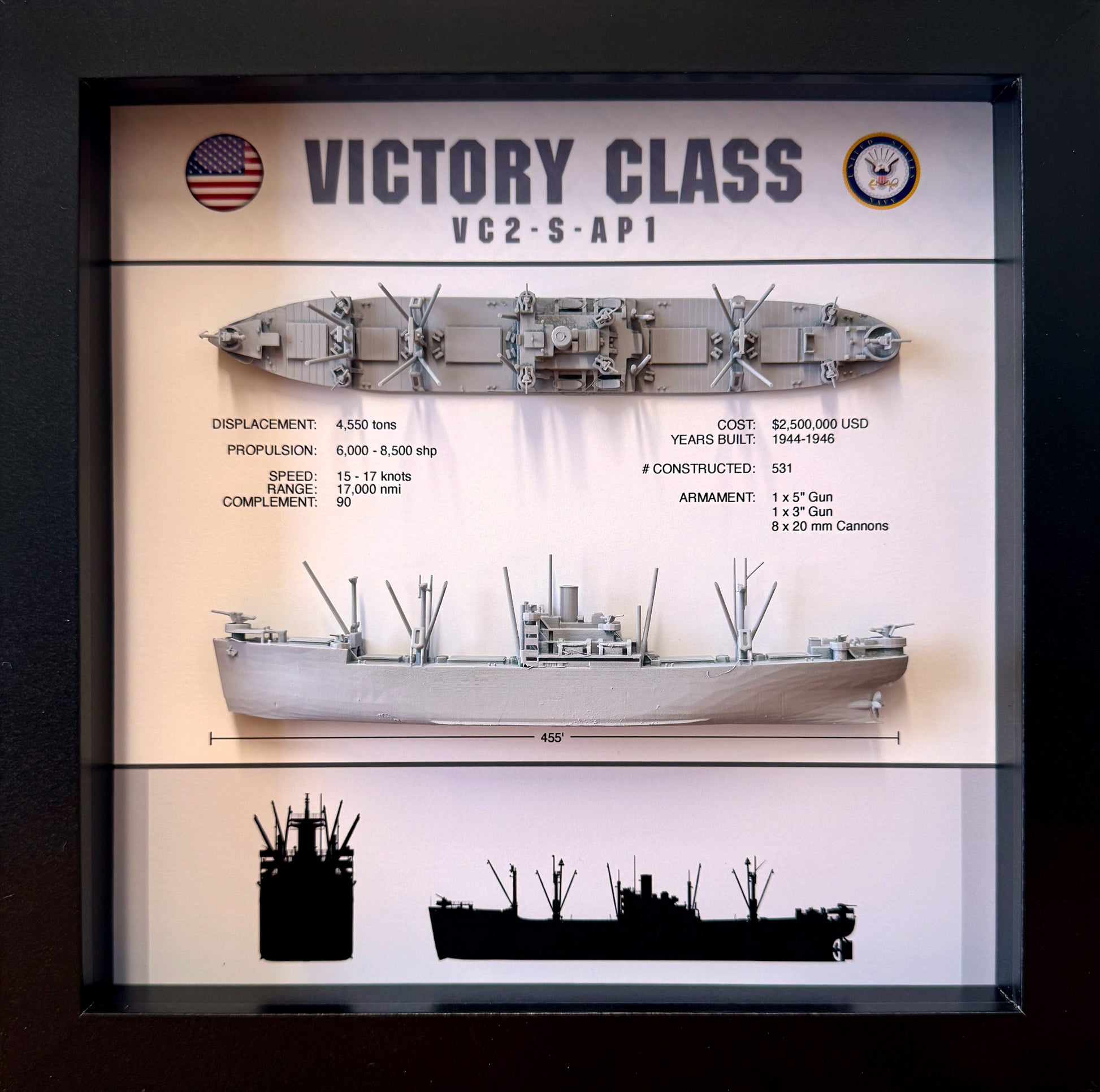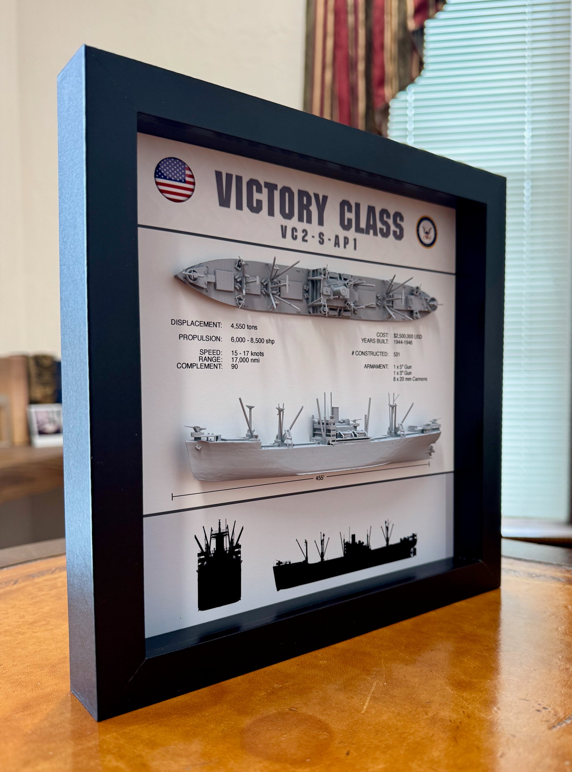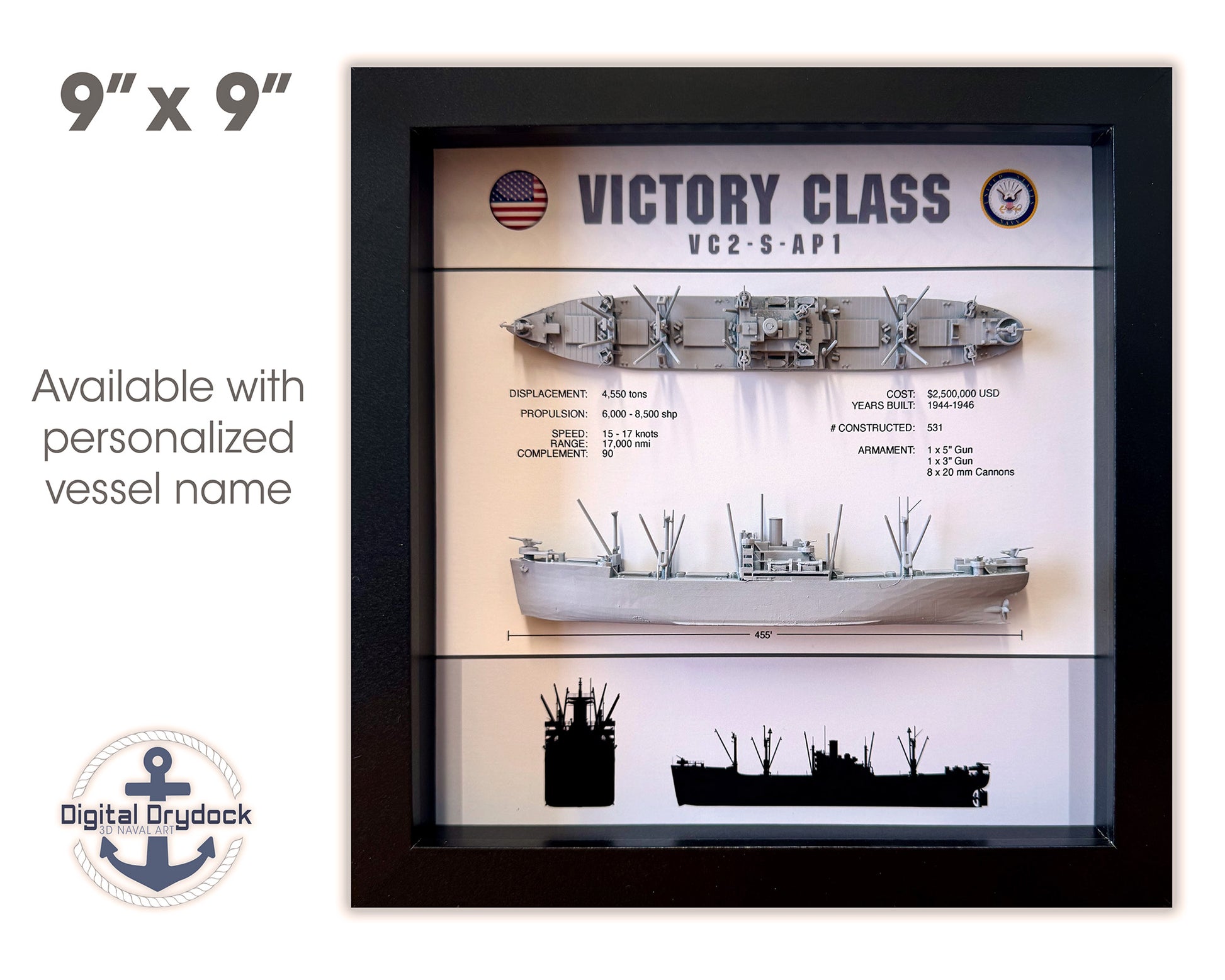 This collector’s display (8.75 x 8.75) showcases a pair of detailed models of the Victory Class vessels and accompanied by key specifications and historical details, this shadow box offers a striking tribute to the enduring legacy of these ships.