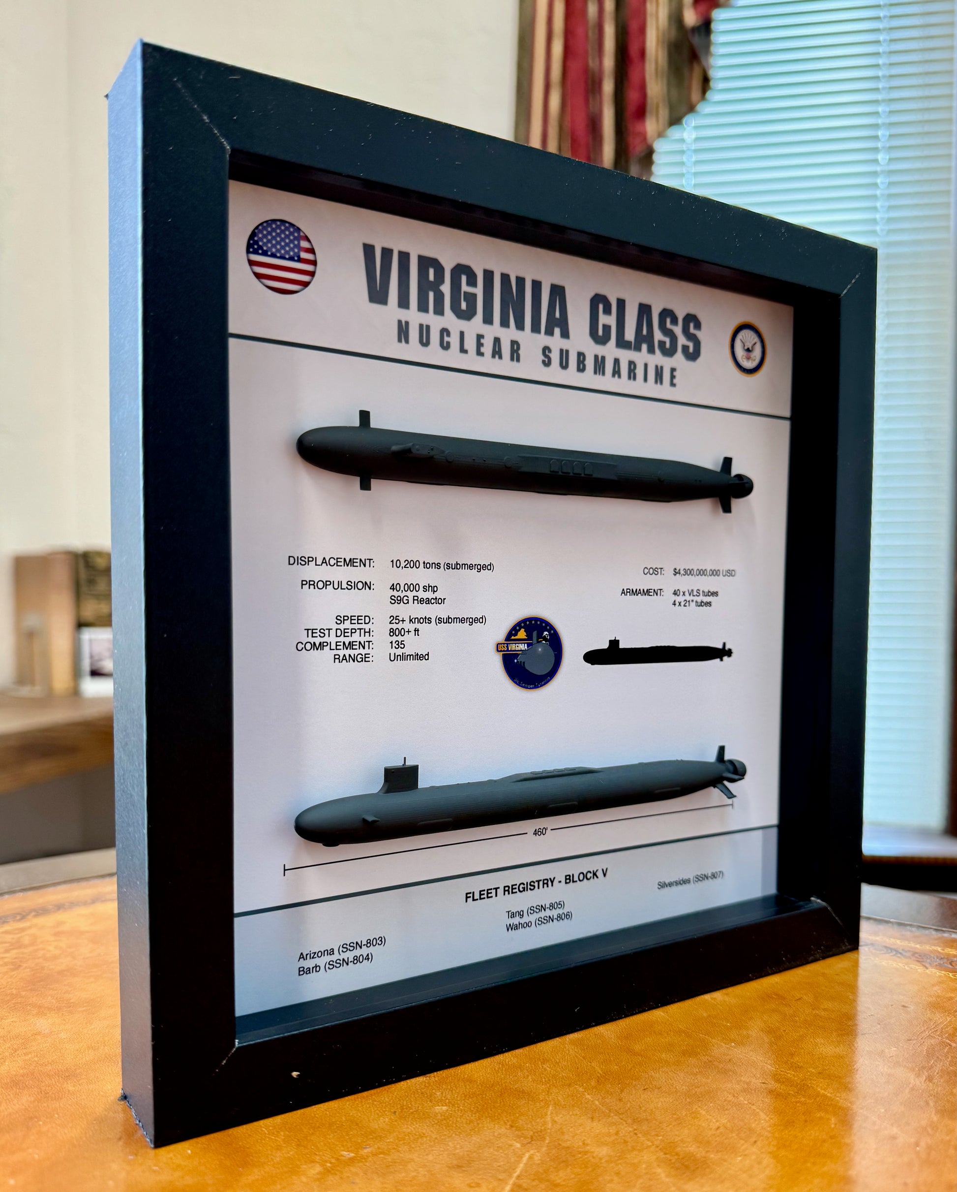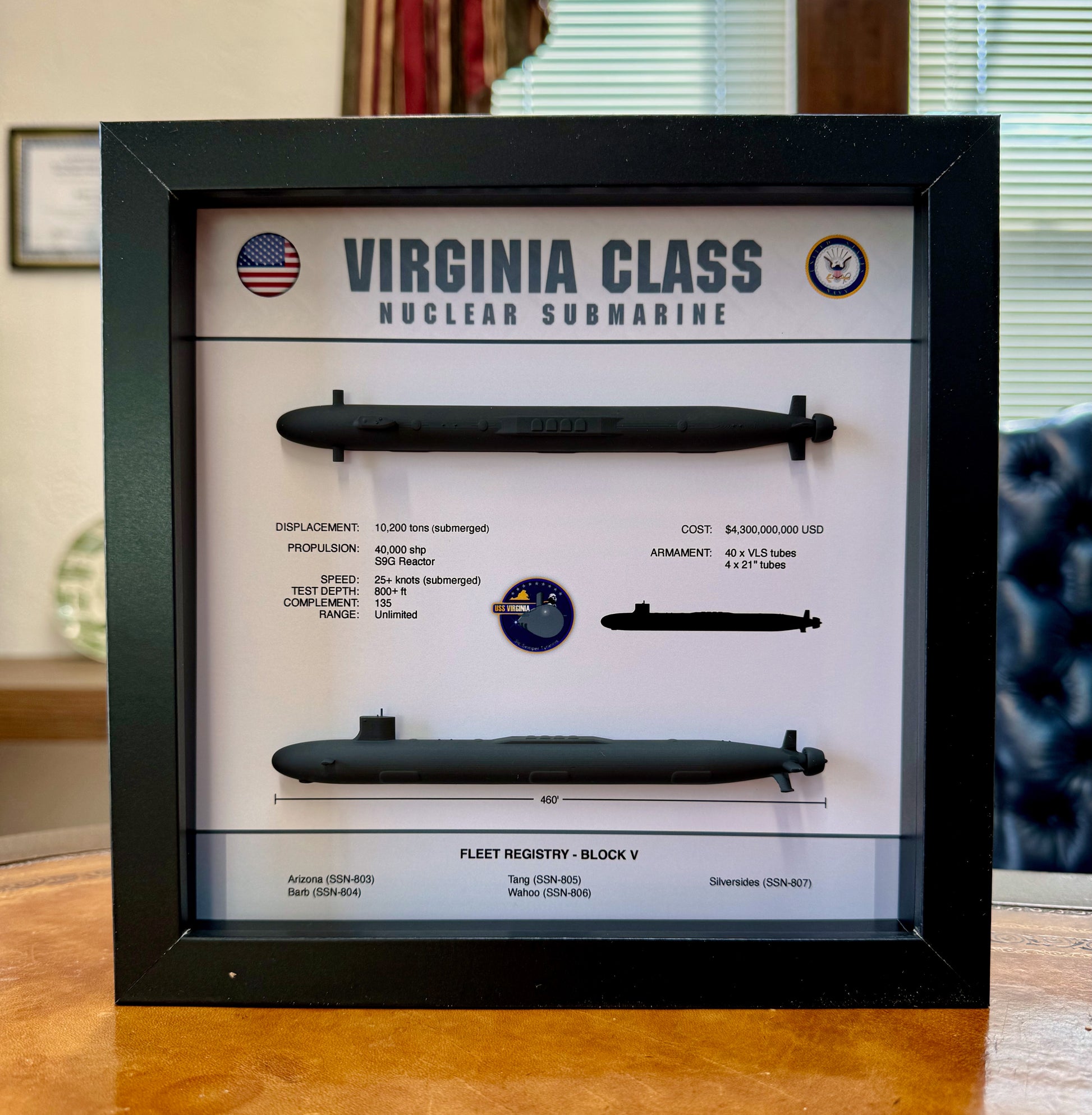 Virginia Class Submarine Memorial Display Shadow Box, Block V with VPM, 9" x 9", Black