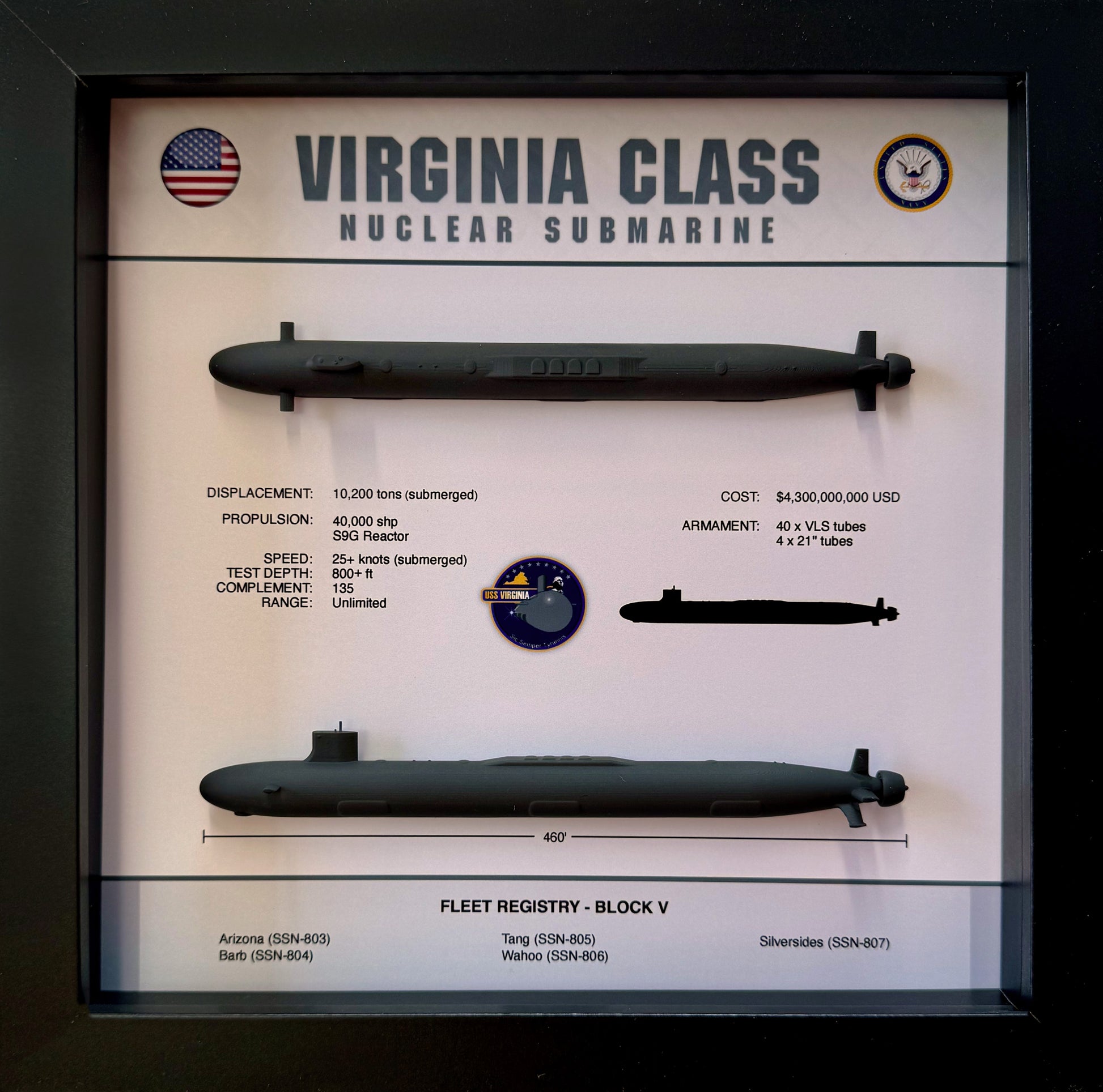 This unique collector box (8.75 x 8.75) pays homage to the latest fast attack nuclear submarine in the US fleet: Block V of the Virginia Class with the Virginia Payload Module. This unique collector's box features two custom made 3D resin models of the block V variant of the Virginia Class submarine - a profile view and an overhead view. In addition to the profile views, this unique display features vital statistics as well as a complete fleet registry listing every Virginia class submarine constructed.