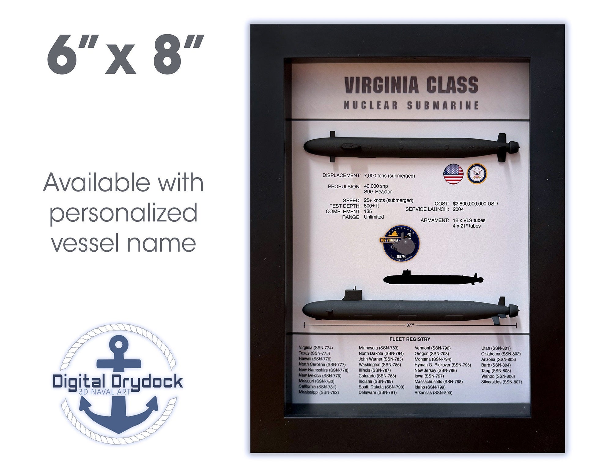 For an additional fee, this frame can be customized to a specific submarine within the Virginia class. The vessel name can be entered in the "Special Instructions" field in the shopping cart during the checkout process.